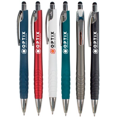 The Groovy Grip Stylus combines sleek design with exceptional comfort, featuring an hourglass-shaped ergonomic barrel and grooved grip. Its shimmering jewel-toned barrel and chrome accents create a modern, eye-catching look. With a soft-touch finish and smooth black gel ink, it provides a superior writing experience, whether on paper or touchscreen devices. Ideal for branding, this stylish, functional pen is the perfect promotional item that blends style with practicality. Material: Plastic Standard Decoration Includes: 1 Color Silk Screen On Barrel All Available Decoration Options: Silk Screen: 1.5" W x 0.5" H Barrel Full Color Digital: 2" W x 0.25" H Barrel Straight Line Copy: No Tip Type: Ball Point Mechanism: Click Extend Standard Packaging: Bulk Tags: Pen, Stylus, Popular, Plastic, Tech, Accessory, Phone, Tablet, Tradeshow, Trade, Show, Desk, Office, Advertisement, College, Grade, Writing, Merchandise, Study, High School, University, Home