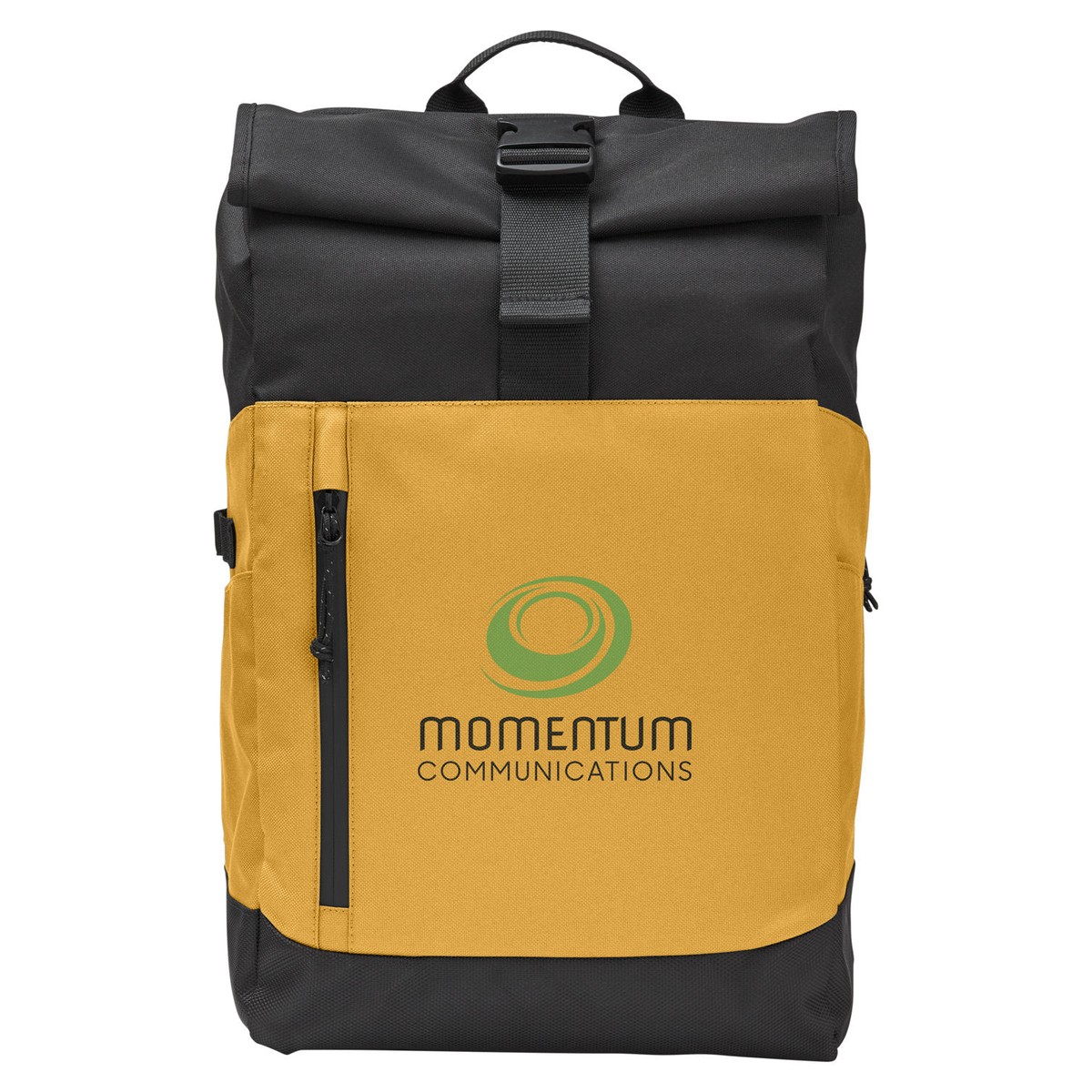 600D Recycled Polyester laptop backpack made from rPET. Adjust for the day's activities with the flexible roll-top design that allows space for extra packing. Separate zippered padded laptop pocket, fits most 15" laptops. Front zippered pocket. Water bottle holders on each side. Pairs nicely with EC9842 econscious Grove 17 oz. Recycled Stainless Steel Vacuum Insulated Bottle (bottle not included). Padded straps and back with luggage pass through. 70% of this item's total composition is made from recycled materials, and the fabrics themself contain 100% post-consumer recycled content. Recommended weight tolerance: 17.5 lbs. 10.6000" W x 16.9000" H x 6.1000" D