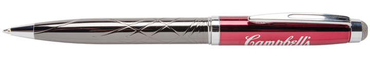 Jumbo twist-action executive pen in high gloss enamel with a gunmetal barrel etched in a contemporary Guilloche engraved design. Features a microfiber stylus designed for increased connectivity with touch screen devices. Includes supersmooth, anti-fraud black ink for secure writing. Backed by the Cambridge Collection lifetime guarantee. Material: Metal Standard Decoration Includes: Lasered, 1 Location All Available Decoration Options: Laser Engraved: 1.25" W x 0.25" H Cap Revolution Engraving: 1.25" W x 0.5" H Cap Tip Type: Ballpoint Mechanism: Twist Standard Packaging: Individually Cellophaned Tags: popular, metal, tech, accessory, phone, tablet, gift, desk, office, executive, advertisement, college, grade, writing, merchandise, study, high school, pen, essay, list