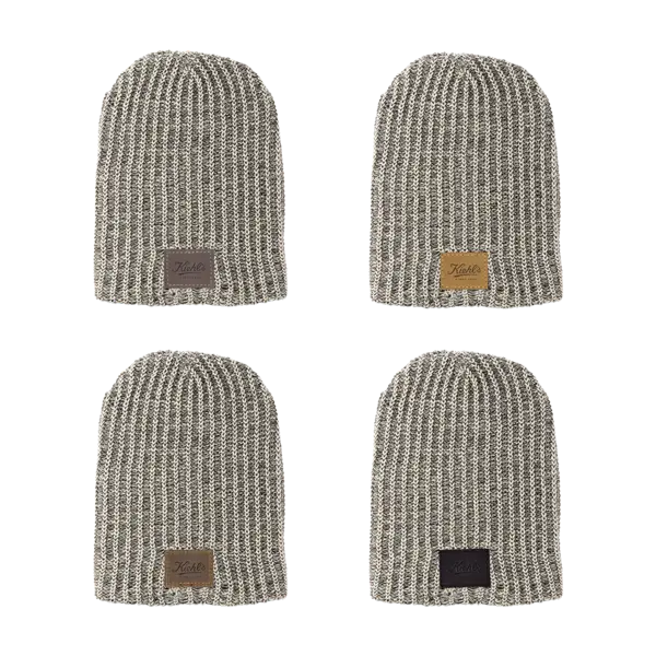 Behold, the solution to bedhead, cold AF winter mornings, and stale marketing: our Haberdasher knit beanie with a leather patch. This keepsake is something people actually want to wear and an ideal promo item for the cool-kid crowd. Make your beanie your own by choosing between one of our USA-made leather color options to show off your logo. While the natural leather will vary slightly in texture and color, this rugged beanie will stay fresh season after season. Complies with Prop 65. 7.84" W x 13.267" L