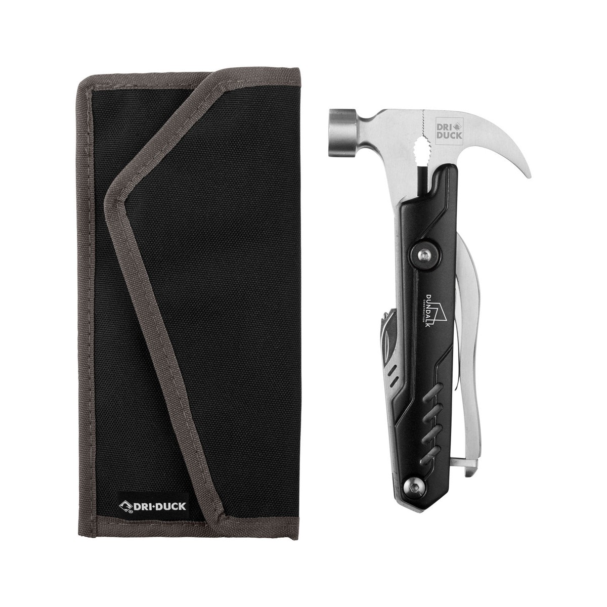 Stainless steel, 600D recycled polyester. This robust product has all the essential tools you need. 11 functions, including:. nail claw. hammer. two (2) pliers. wire cutter. knife. saw. nail file. bottle opener. two (2) screwdrivers. 3.5000" W x 6.9000" H x 0.8000" D