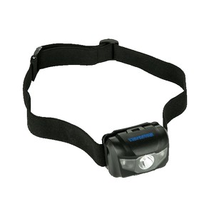Adjustable LED headlamp with four lights modes (white solid, white dim, red sold, red flashing). Features angled head and adjustable elastic strap. 110 lumen output. Requires 3 AAA batteries (included). 1.578125" H x 2.375" W