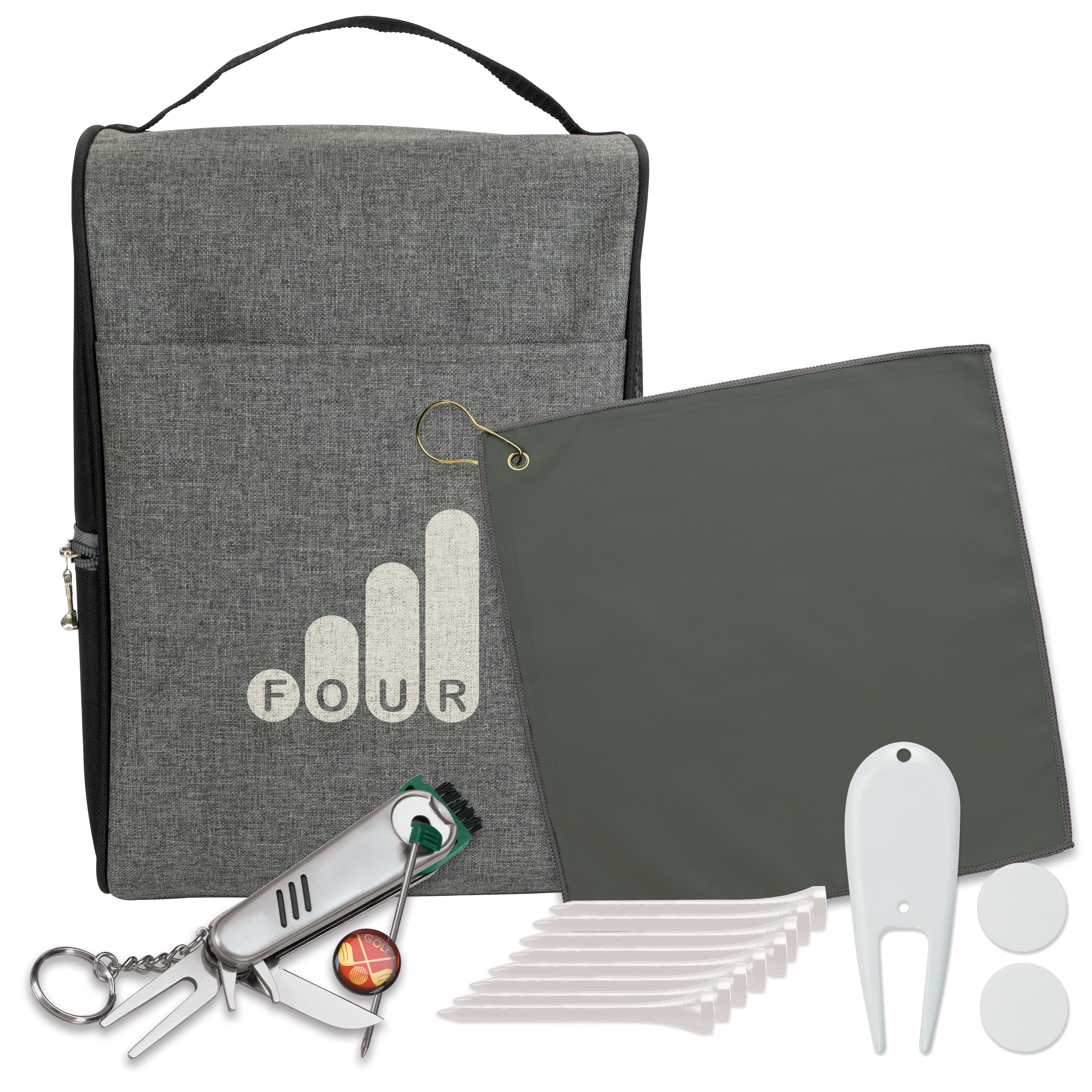 Any golf enthusiast would be happy to receive this premium kit that includes a towel, shoe bag, golf tool keyholder, eight 2-3/4" white tees, 2 white dime-sized ball markers, and a white divot tool. Available at an attractive price, this gift will make a real impression on your clients at your next golf outing. (Custom quote for imprinting on components is available upon request.). 9.0625" W x 14" H x 5.9375" D