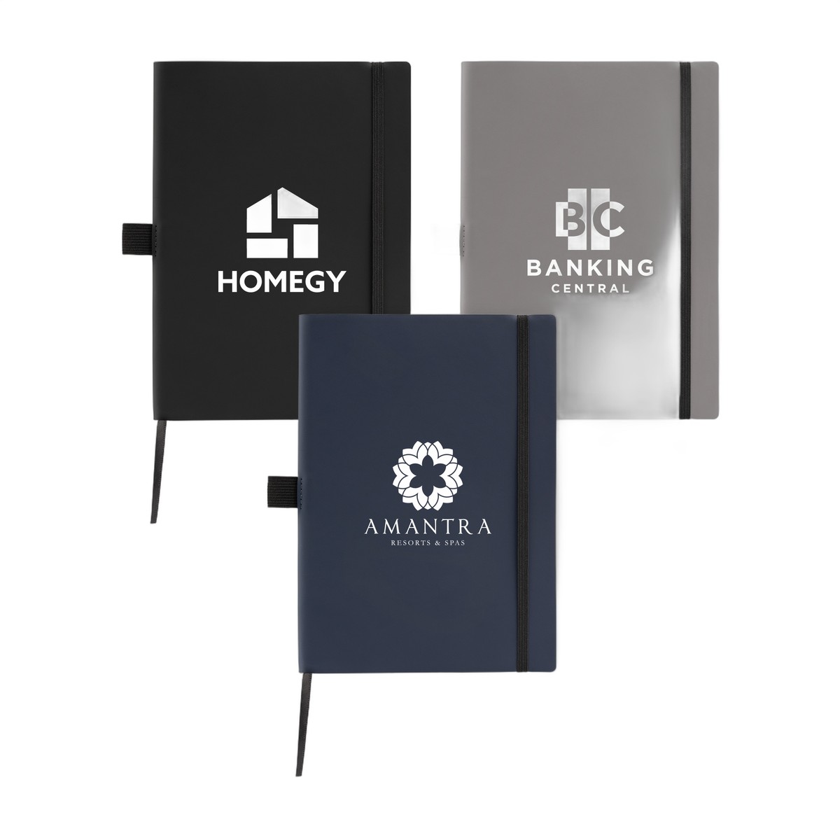 Introducing the Hemingway Recycled Soft Cover Journal - A5 5.5" x 8.3"- crafted from GRS-certified RPET. This A5-sized notebook features rounded edges and a soft cover. Inside, it houses 80 sheets (160 pages) of 70 gsm white paper sourced via responsible forestry, lined for easy writing and securely bound with glue. Enhanced with a black satin ribbon integrated into the spine for easy page marking, the notebook also includes a practical black pen loop and elastic strap on the right back cover for secure storage. 8.27" H x 5.91" W x 0.54" D