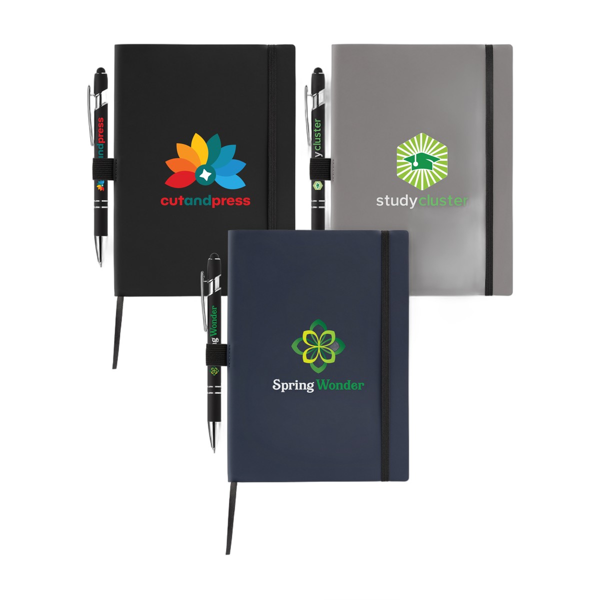Introducing the Hemingway Recycled Soft Cover Journal & Pen Set - A5 5.5" x 8.3" - This set includes both a journal and a pen designed for functionality and style. The A5-sized notebook is crafted from GRS-certified RPET, it features rounded edges and a soft cover. Inside, it houses 80 (160 pages) sheets of 70 gsm white paper sourced via responsible forestry, lined for easy writing and securely bound with glue. Enhanced with a black satin ribbon integrated into the spine for easy page marking, the notebook also includes a practical black pen loop and elastic strap on the right back cover for secure storage. Complementing the journal is the MZJ recycled aluminum pen with anti-fraud ink, available in black to match all notebook colors. Add your brand with our deboss process that impresses your logo into the cover, for a tone-on-tone, 3-D effect. We recommend a minimum text font size of 8 pt, and minimum line weight of 1 pt. Complies with Prop 65. 8.27" H x 5.91" W x 0.54" D