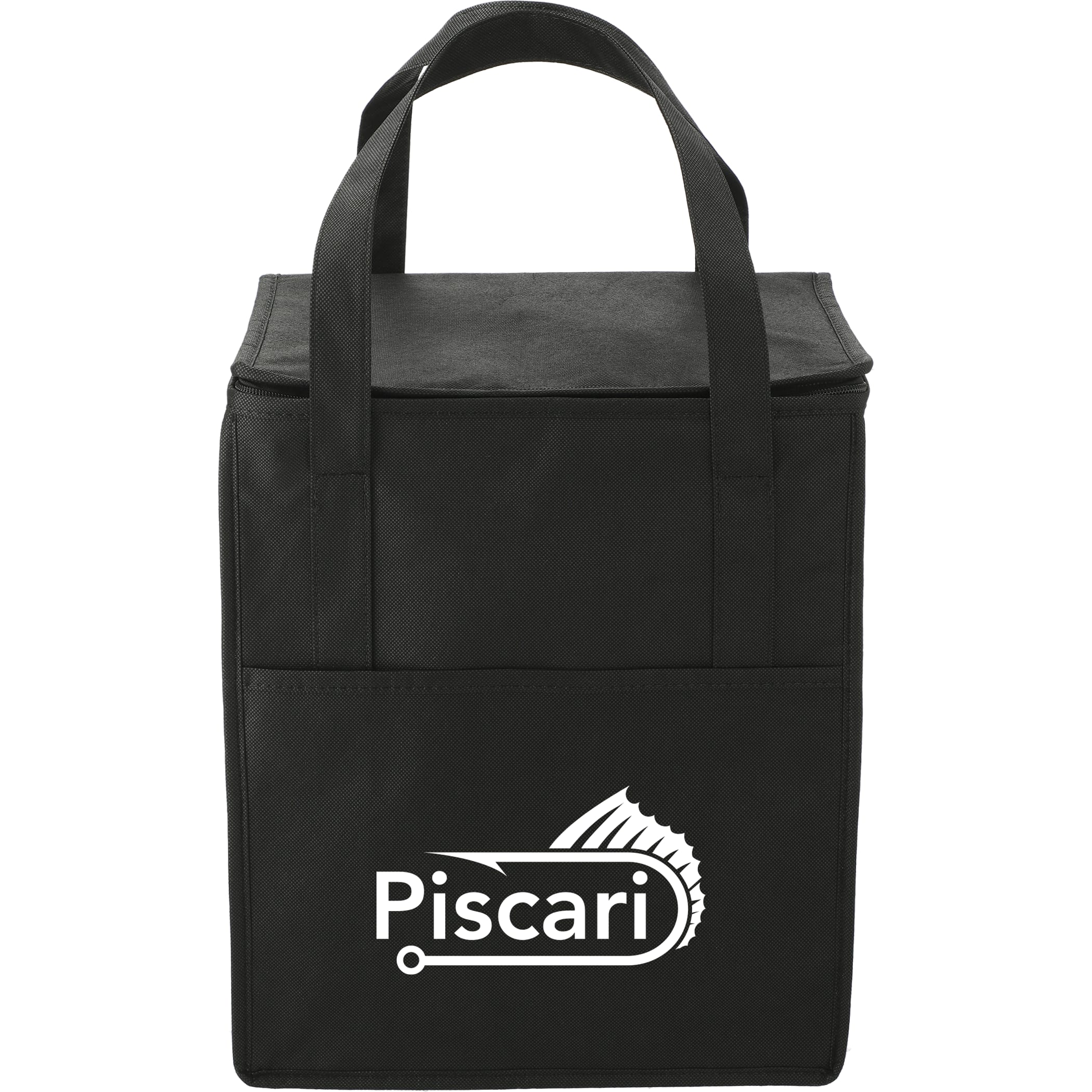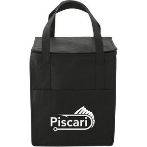 The Hercules Flat Top Insulated Grocery Tote features a large open main compartment and front slash pocket, plus a zippered closure and 22 pound weight capacity. Made from 80gsm non-woven polypropylene. 10.00" D x 13.00" W x 15.00" H