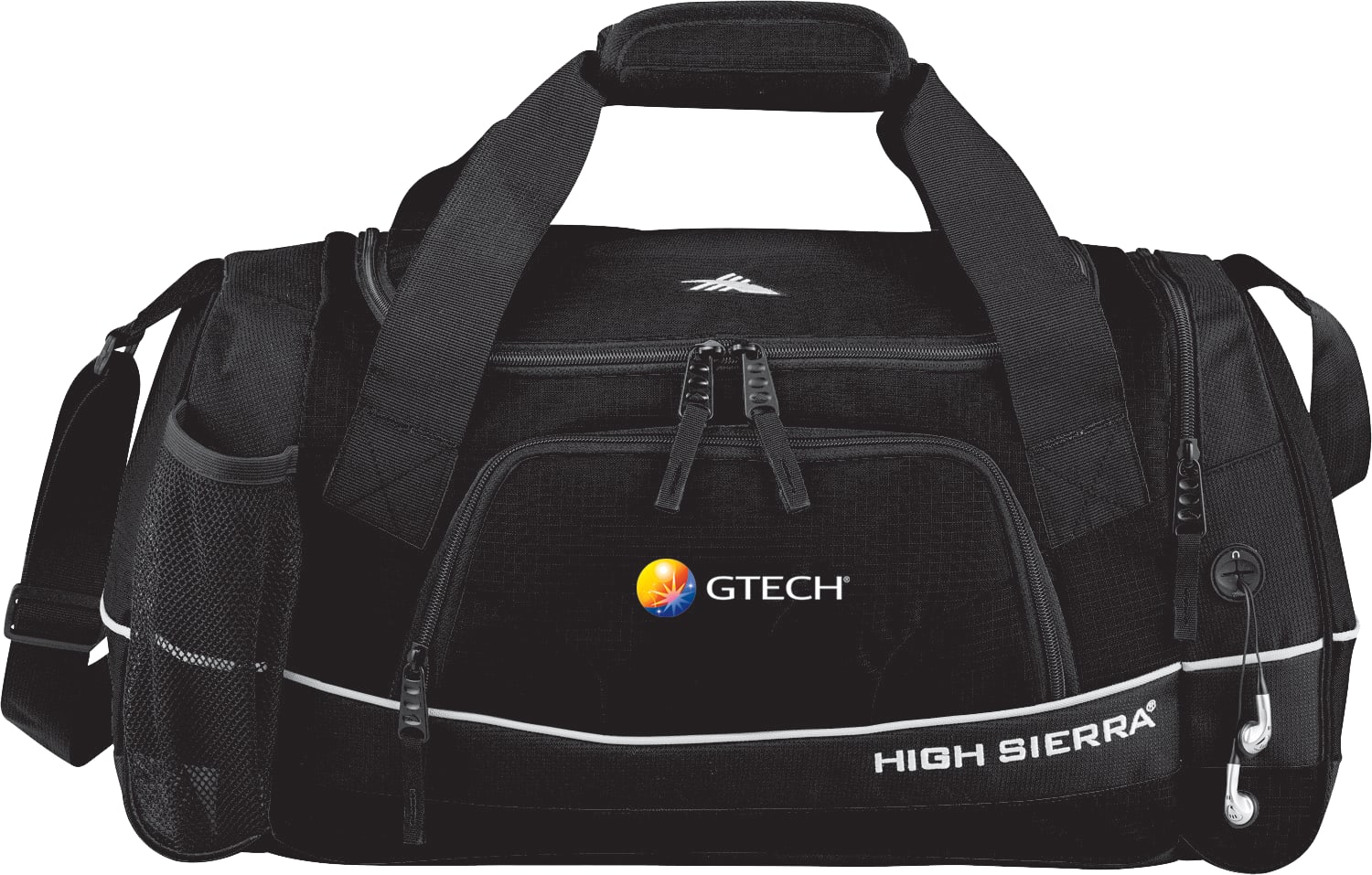 The High Sierra Bubba Duffel bag includes a large main compartment with U-shaped zippered opening and a zippered end pocket with a media pocket and headphone port. Store your water in the mesh water bottle pocket. This custom duffel bag includes handles with durable webbing and neoprene wrap to wick moisture. The High Sierra Bubba Duffel includes an adjustable padded shoulder strap and self-repairing nylon coil zippers. The High Sierra Bubba Duffel bag is covered by a lifetime warranty. 9.50" D x 10.00" W x 22.00" H