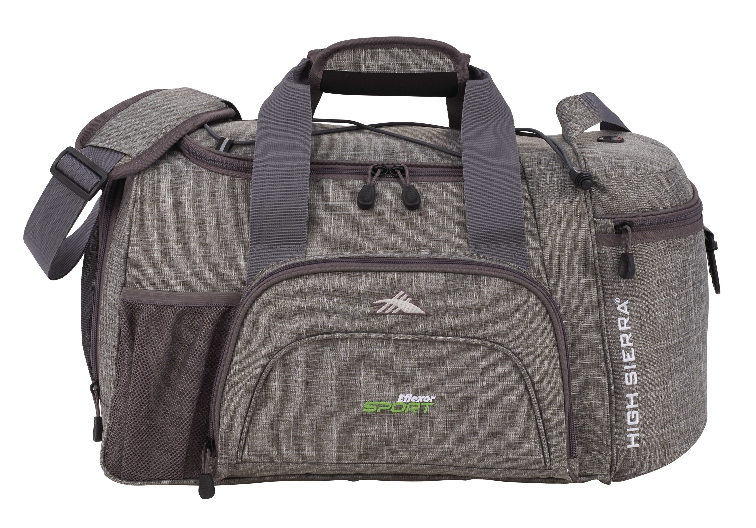 The High Sierra Switch Blade Sport Duffel Bag includes a large main compartment with U-shaped opening and an end media pocket with a headphone port. Store wet clothes in the mesh wet compartment, which rolls up when not in use. This sport duffel includes a zippered front pocket and elastic shock cord and large clip to attach extra gear. The High Sierra Switch Blade Sport Duffel Bag is easy to carry with an adjustable shoulder strap and includes a lifetime warranty. 10.00" D x 22.00" W x 10.50" H