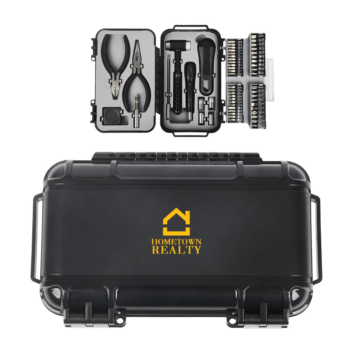 Tackle home repairs like a pro with the Humphrey 56-Piece Tool Kit. This kit is packed with top-quality tools designed to handle a wide range of tasks and all tools are neatly organized in a hard plastic storage case made from durable ABS for your convenience. The 2-part screwdriver handle means easier access in tight spaces and the 45-piece bit set includes 2 adapters and a 4" extender along with multiple sizes of star, hex, square, phillips and flat heads. Also included are a socket adapter and 4 socket heads and its spring-loaded wirecutter and needlenose pliers have rubber grip handles providing you with the control you need to get the job done. This set also features a dual head hammer with both a plastic mallet and a steel heads, and its 3-foot tape measure and box cutter provide often needed quick home help. Make your DIY home projects more enjoyable and efficient with Humphrey Tool Kit! Complies with Prop 65. 8 1/4" W x 2 5/8" H x 5 1/8" D