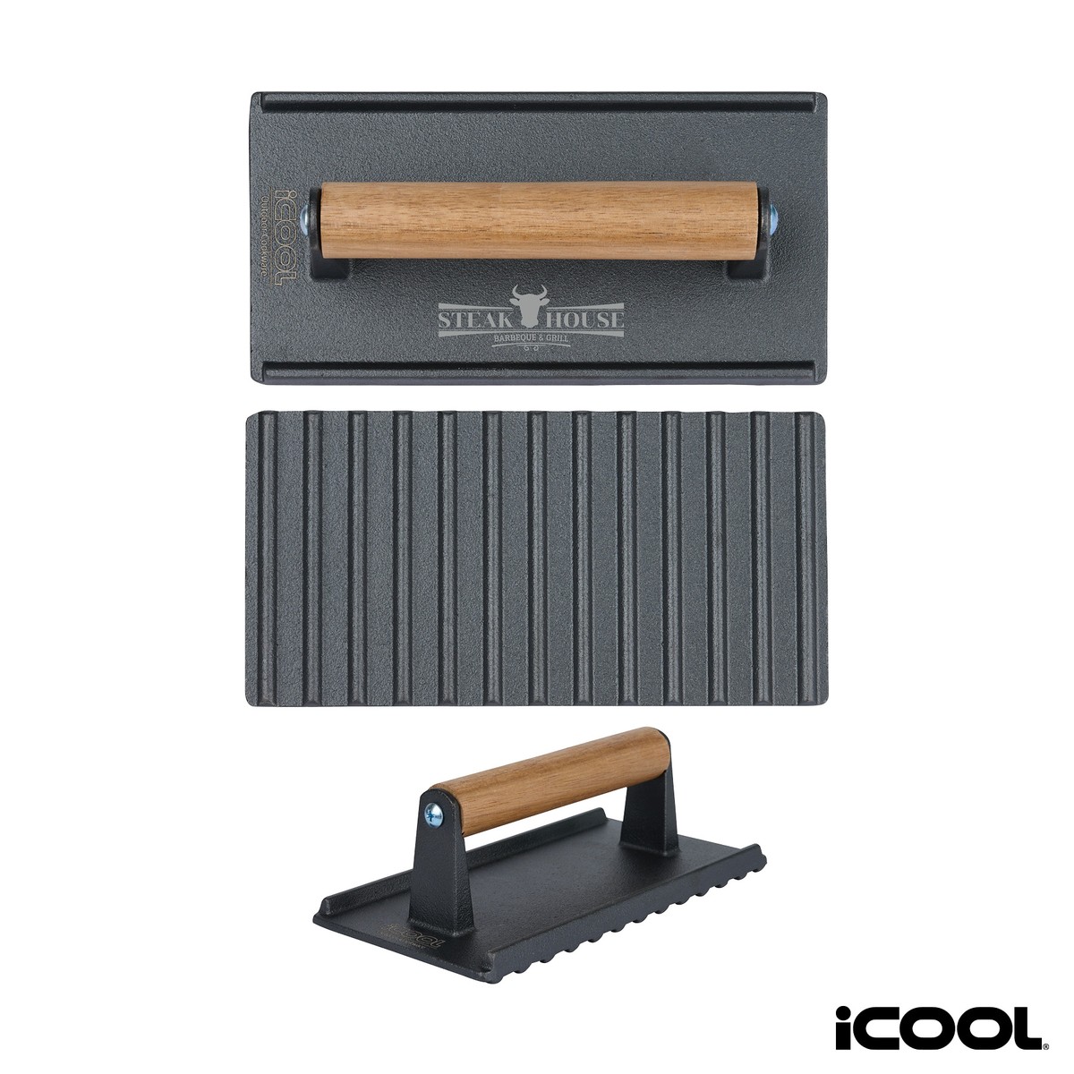 Elevate your grilling and cooking with the iCOOL Kodiak Cast Iron Meat Press, designed to deliver even heat and a perfect sear every time. The rectangular ribbed cooking surface presses down on meats, sandwiches, and burgers for consistent cooking and appetizing grill marks. It features a pre-seasoned cast iron surface for natural non-stick performance and durability, paired with an acacia wood handle for a comfortable, heat-resistant grip. With a press area of 7 3/4 x 4 inches, its perfectly sized for a variety of dishes, making it a versatile addition to any kitchen or outdoor grill. A portion of all proceeds is donated to Shelter to Soldier, a non-profit organization that rescues dogs to train as service animals for veterans in need. Complies with Prop 65. 7 3/4" W x 2 5/8" H x 4" D
