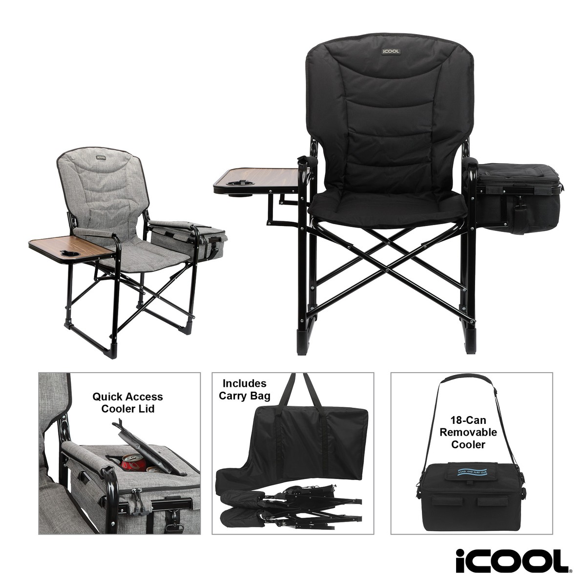 With a side table for your snacks and a removable cooler with PEVA lining to keep your drinks cold, the iCOOL Twin Peaks Deluxe Camping Chair with 18-Can Cooler is perfect for any outdoor adventure. Made of durable 600D Polyester, this portable camping chair is versatile, practical, and functional. Once folded, use the included carry bag that can be slung over your shoulder to make packing and carrying a breeze. The padded back, seat and arm rests provide comfort and the quick-access cooler lid makes grabbing that next refreshment easy. Its reinforced steel frame is well constructed and tested to hold up to 450 lbs. A portion of all proceeds is donated to Shelter to Soldier, a non-profit organization that rescues dogs to train as service animals for veterans in need. Complies with Prop 65. 44 1/4" W x 23 1/2" H x 39 1/4" D
