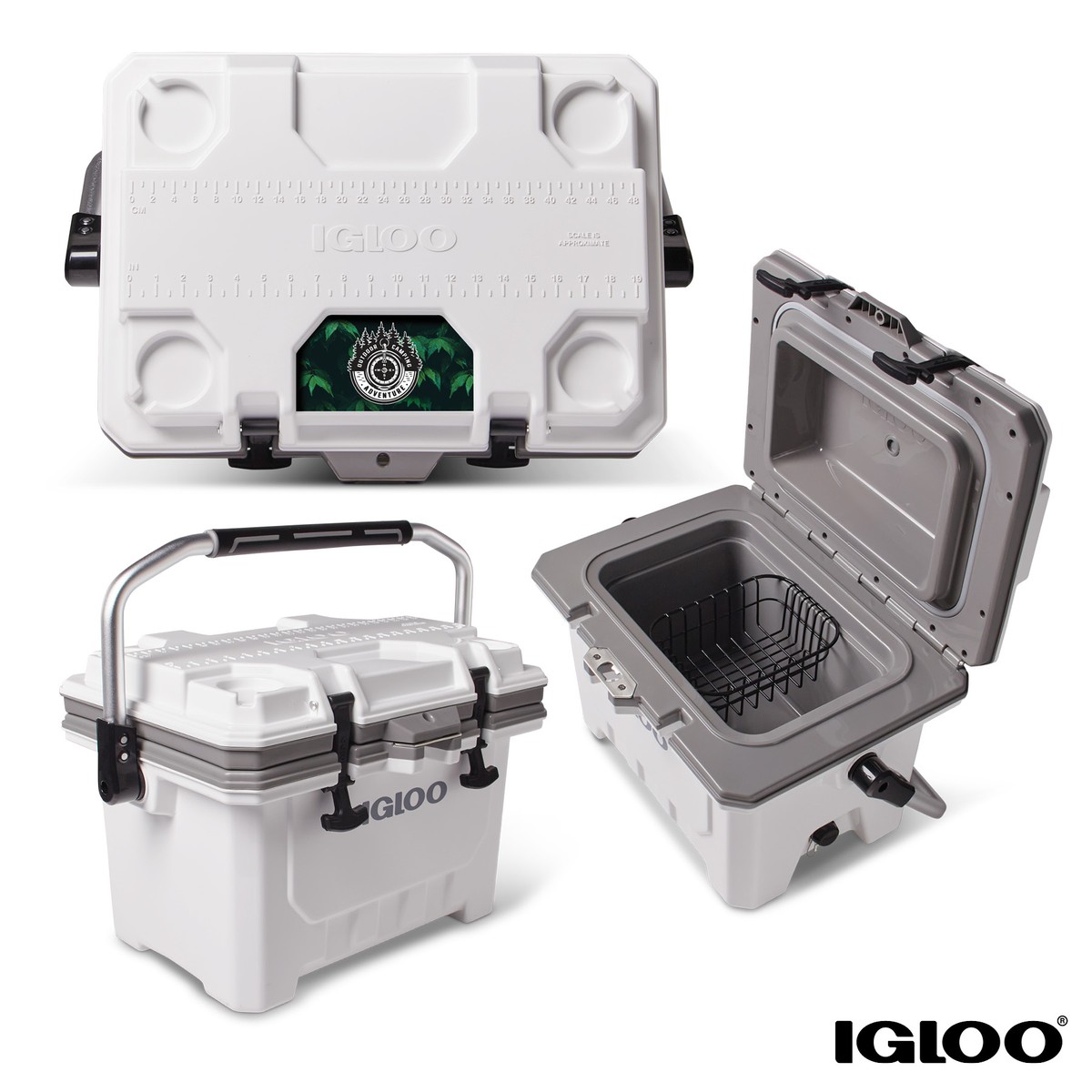 The IMX24 QT Cooler by Igloo is lightweight yet provides heavy-duty performance! Its Ultratherm foam-insulated walls and lid provide superior, extended cold retention performance that keeps ice up to 4 days, the Cool Riser Technology improves cooling performance by elevating the cooler body away from hot surfaces, and the UV inhibitors help protect the cooler from sun damage. The solid injection-molded construction provides advanced durability, and marine-grade, rubberized T-latches provide a secure lid closure. The 35-can capacity IMX24 also features a suspended, removable interior wire food basket to help keep smaller items dry, a sturdy swing handle with grip, threaded drain plug with tethered cap, and an integrated lock-ready metal plate provides an extra security option. The lid has four self-draining cup holders, a built-in stainless steel bottle opener, self-stopping hinge to hold the lid open and a molded-in fish ruler. This Igloo product includes a limited 5 year warranty. Complies with Prop 65. 16 1/8" W x 24 3/8" H x 16" D