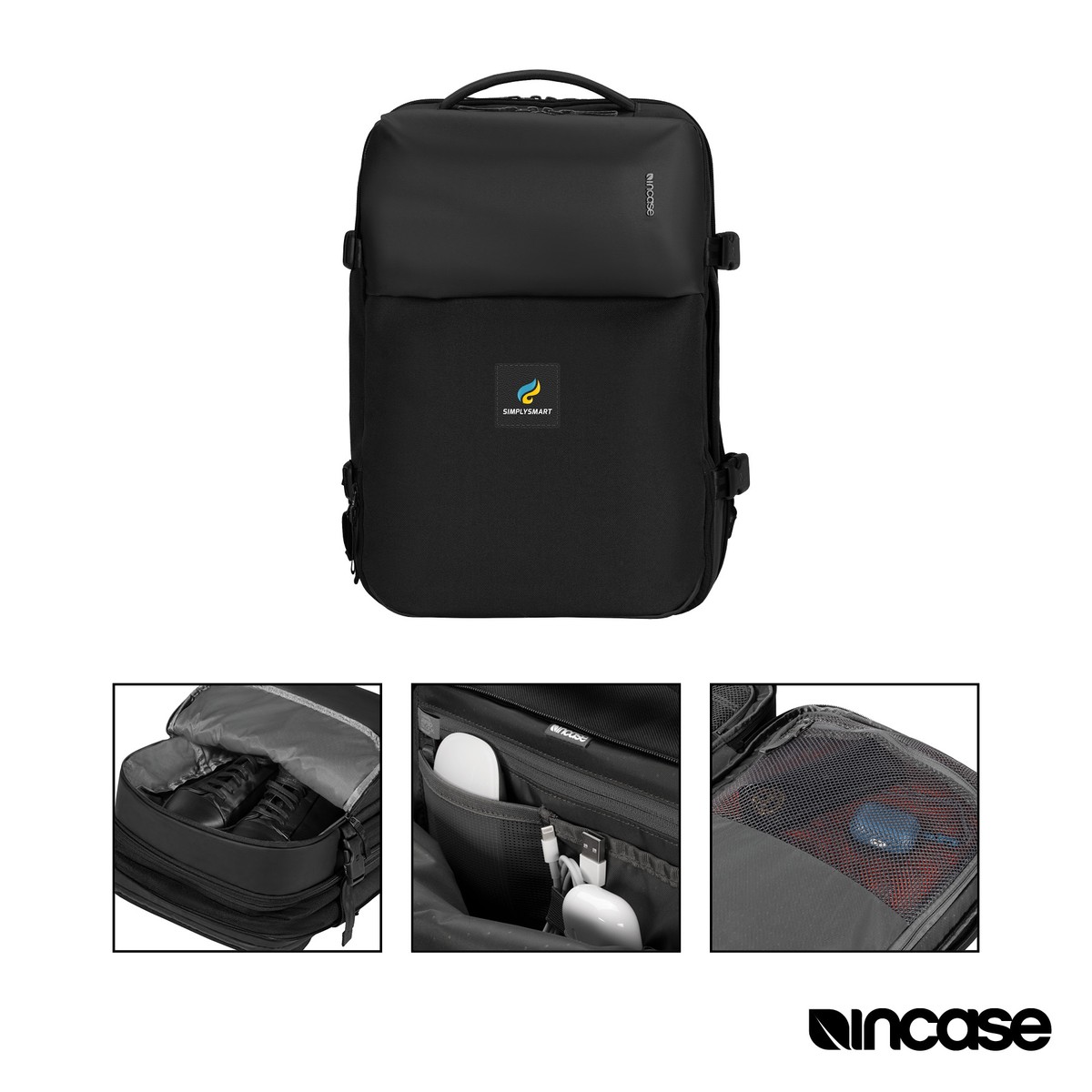 Sleek enough for executive travel, comfortable as a daily office go-to, and ready for a weekend trip, the Incase A.R.C. Travel Pack is the ultimate tech and lifestyle crossover bag. Made with ReSpun 100% Recycled Polyester exterior material in a durable 900D x 1200D weave with C0 water repellent coating, this sustainable option provides all the features needed. It has a dedicated zippered 16" laptop pocket with faux fur lining, a weather resistant top pocket with organization and an RFID protected interior zippered pocket, and a deep front zippered pocket. A zippered shoe pocket is accessible from the bottom, and the main compartment features luggage-style mesh restraints, zippered mesh pocket, reinforced buckled straps, and zippered expansion that provides an extra 3" when needed. Padded side and top handles, trolley strap and padded adjustable backpack straps with ergonomic sternum strap provide versatile and comfortable carry options. Complies with Prop 65. 12" W x 17 1/4" H x 7 1/2" D