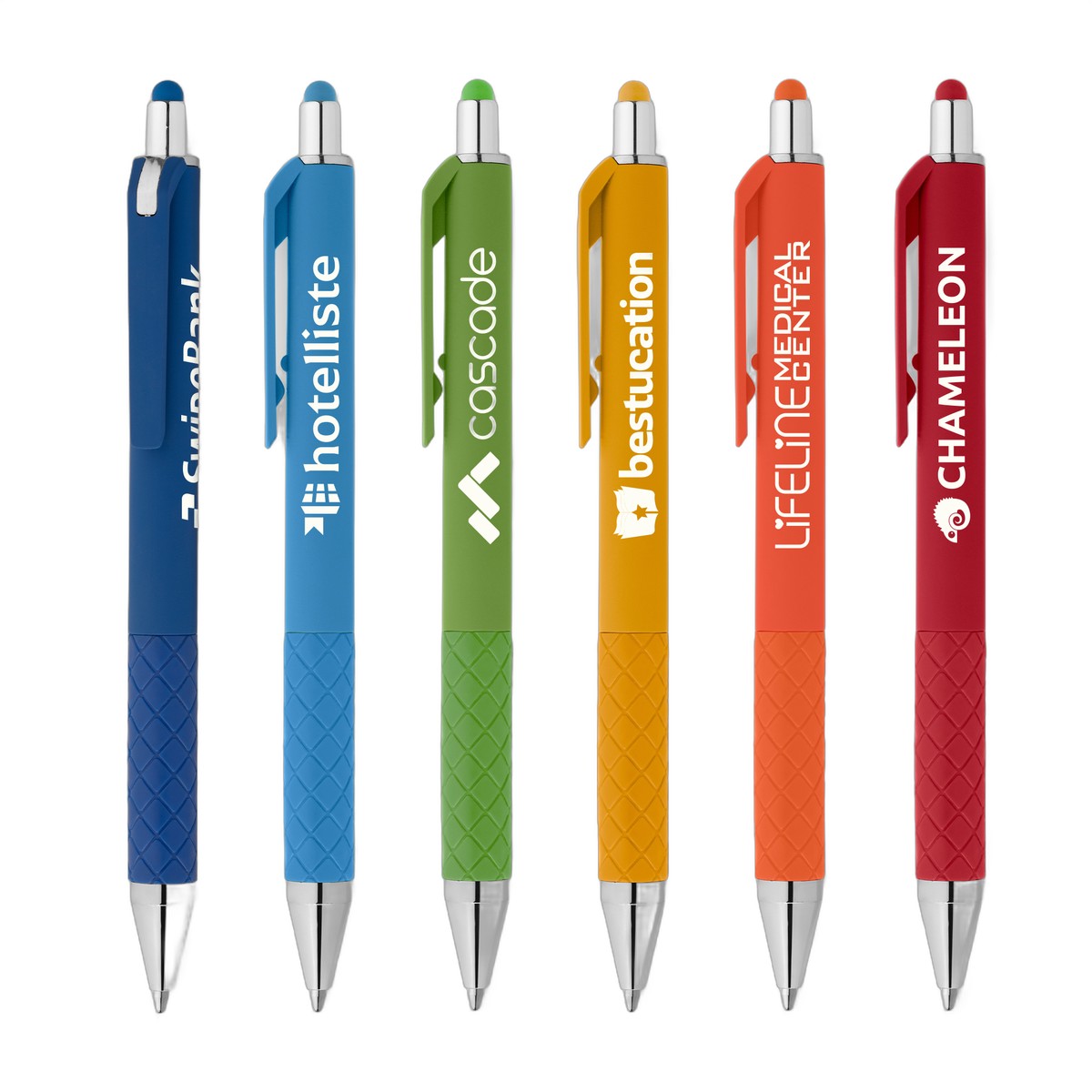 Crafted from ABS plastic, the Islander Gel Retractable Bright Stylus Pen features a diamond-textured lower barrel paired with a soft-touch rubber finish for a comfortable grip. The shiny chrome plunger and tip add a sleek, polished look, while the color-matching stylus on the plunger ensures functionality. Equipped with a slim 1.0mm gel refill, the pen offers a smooth 500m write-out for effortless writing. Complies with Prop 65. 5.82" W x 0.39" D