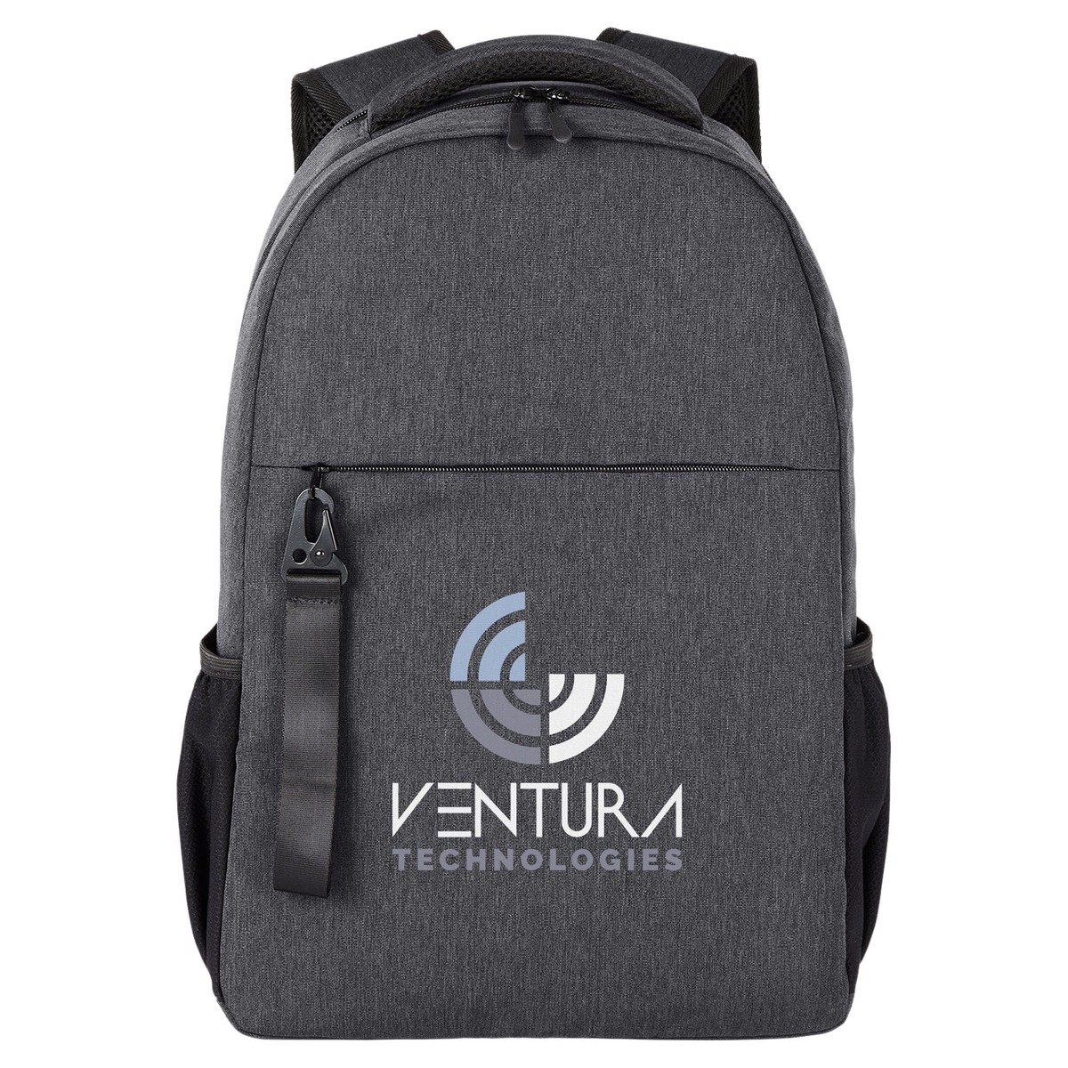 300D Recycled 2-tone Polyester laptop backpack designed for the modern minimalist with effortless style details including a detachable key strap. Two padded main compartments, one with file pocket, two pen slots and two small open slash pockets; the other with padded laptop pocket with elastic strap hook and loop closure. Holds 15.6" laptop. Zippered front pocket; two side mesh bottle pockets. Padded air mesh back; padded air mesh adjustable shoulder straps, padded air mesh grab handle and PP webbing luggage pass through. Spot clean only. 25% of this item's total composition is made from recycled materials, and the materials themself contain 100% post-consumer recycled content. Recommended weight tolerance: 22 lbs. 11.8000" W x 17.3000" H x 6.3000" D
