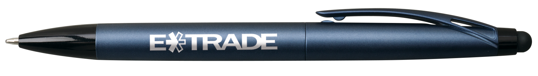 Rich corporate colors and handy stylus tip make this promotional pen stand out. Shimmering metallic finish and strong twist retraction for executive pen appeal. Stylus designed for increased connectivity with all high tech devices. Generous imprint area. Material: Plastic Standard Decoration Includes: 1 Color, 1 Location All Available Decoration Options: Silk Screen: 1.75" W x 0.75" H Barrel Tip Type: Ballpoint Mechanism: Twist Standard Packaging: Bulk Tags: popular, plastic, tech, accessory, phone, tablet, tradeshow, trade, show, desk, office, advertisement, college, grade, writing, merchandise, study, high school, university, home