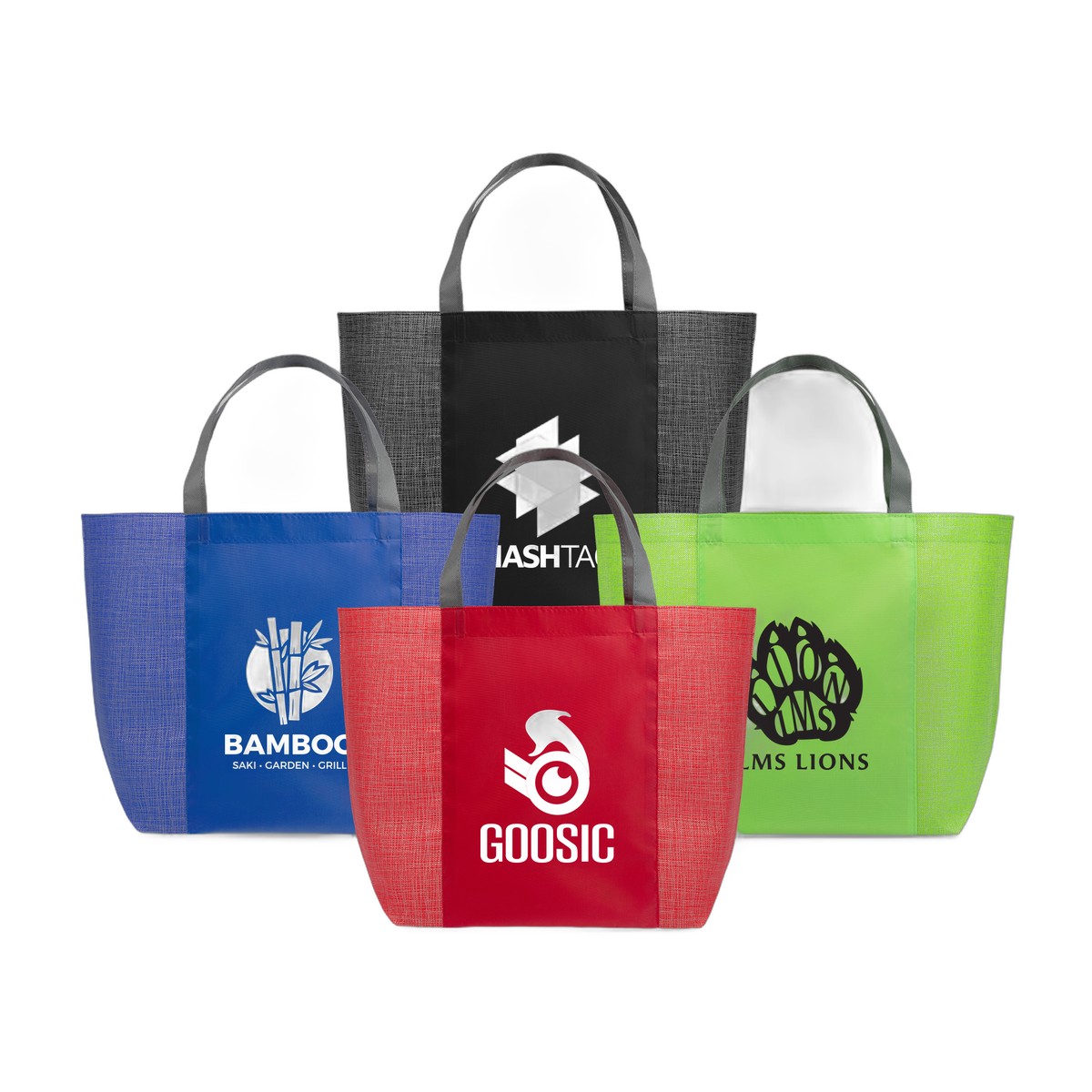The Julian Plus Shopping Tote is constructed with 80 gram non-woven polypropylene with stylish cross-hatch pattern, and a solid-color 210D polyester center section. This reusable tote bag measures 20'' wide x 13'' high, with an 8'' wide gusset, so it's ideal for shopping. This tote bag has a large imprint area, so it's perfect for advertising your company with a 1-color silkscreen imprint. Complies with Prop 65. 13.00" H x 20.00" W x 8.00" D