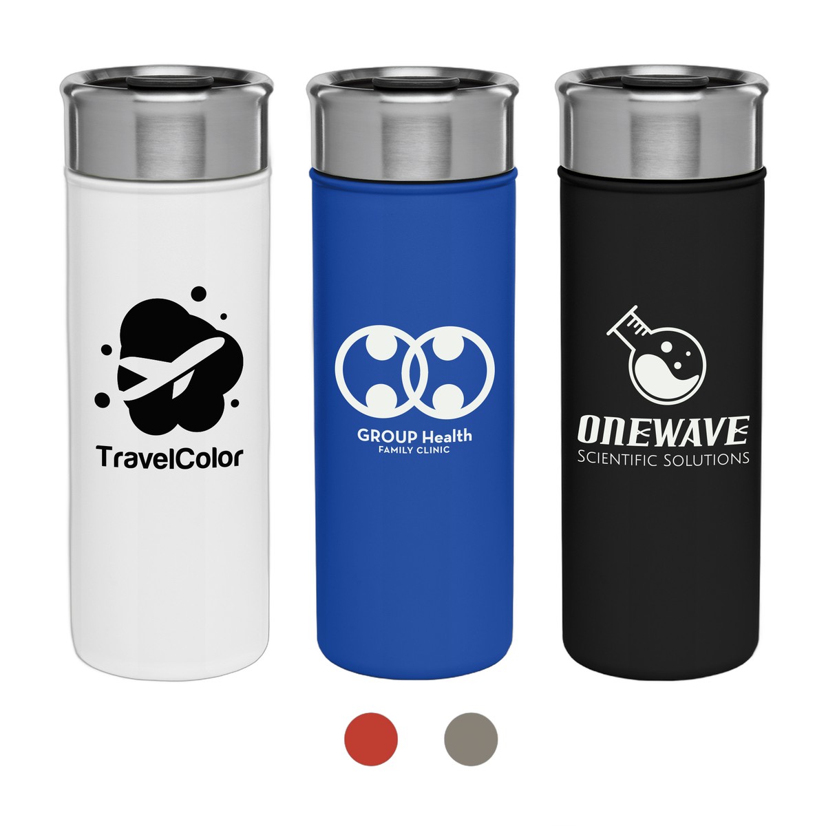 This stylish double-wall stainless steel tumbler has a durable powder-coated exterior for a soft grip and matte finish, and features a screw-on stainless steel lid with a black spill-resistant, flip-top sipping area. Vacuum-insulated with copper lining, the Kauai tumbler can be used for hot and cold beverages, keeping drinks hot for up to 12 hours and cold for up to 24 hours. . CA Prop 65 compliant. BPA free. Complies with CPSIA, FDA, Prop 65. 8.27" H x 2.87" W