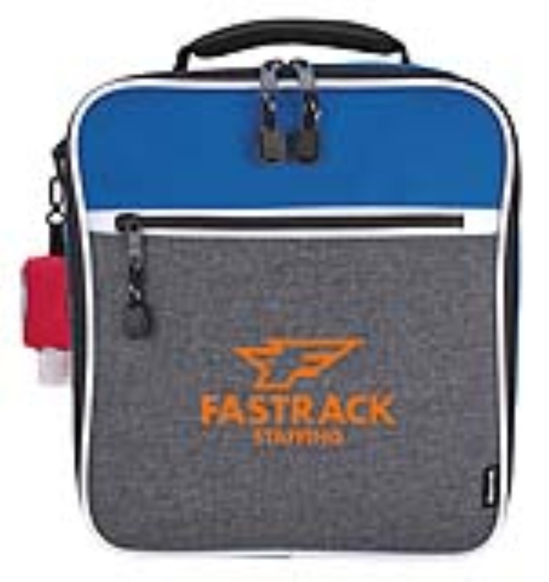 This two-tone lunch cooler is great for a quick lunch between classes or meetings. Its main compartment has double zippers for quick access and a side D-ring gives you room to hang your keys or hand sanitizer. 9" W x 10.25" H x 4.875" D