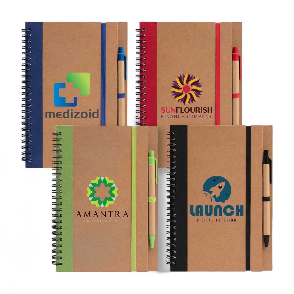 Discover the natural charm of our Kraft Hard Cover Spiral Notebook with Pen, designed for creativity and practicality. The journal features a front cover made from durable craft paper, accented with rPET fabric on the left side and a craft paper and RPET fabric stripe on the back. A color-matching elastic pen loop and strap, secured with a silver grommet on the back cover, ensure easy access and closure. Inside, you will find 70 sheets (140 pages) of 70 gsm white paper sourced via responsible forestry, with collegiate lines, perfect for organized note-taking and creative expression. The black metal spiral binding adds durability and a sleek finish. The included pen features a craft paper barrel and retractable design, with ABS components (top, plunger, clip, tip) that match the fabric color on the cover for a cohesive look. Compact at 5.83" x 8.27" x 0.39", this journal and pen set combines functionality with materials inspired by nature, making it an ideal choice for professionals and. Complies with Prop 65. 8.27" H x 5.28" W x 0.39" D