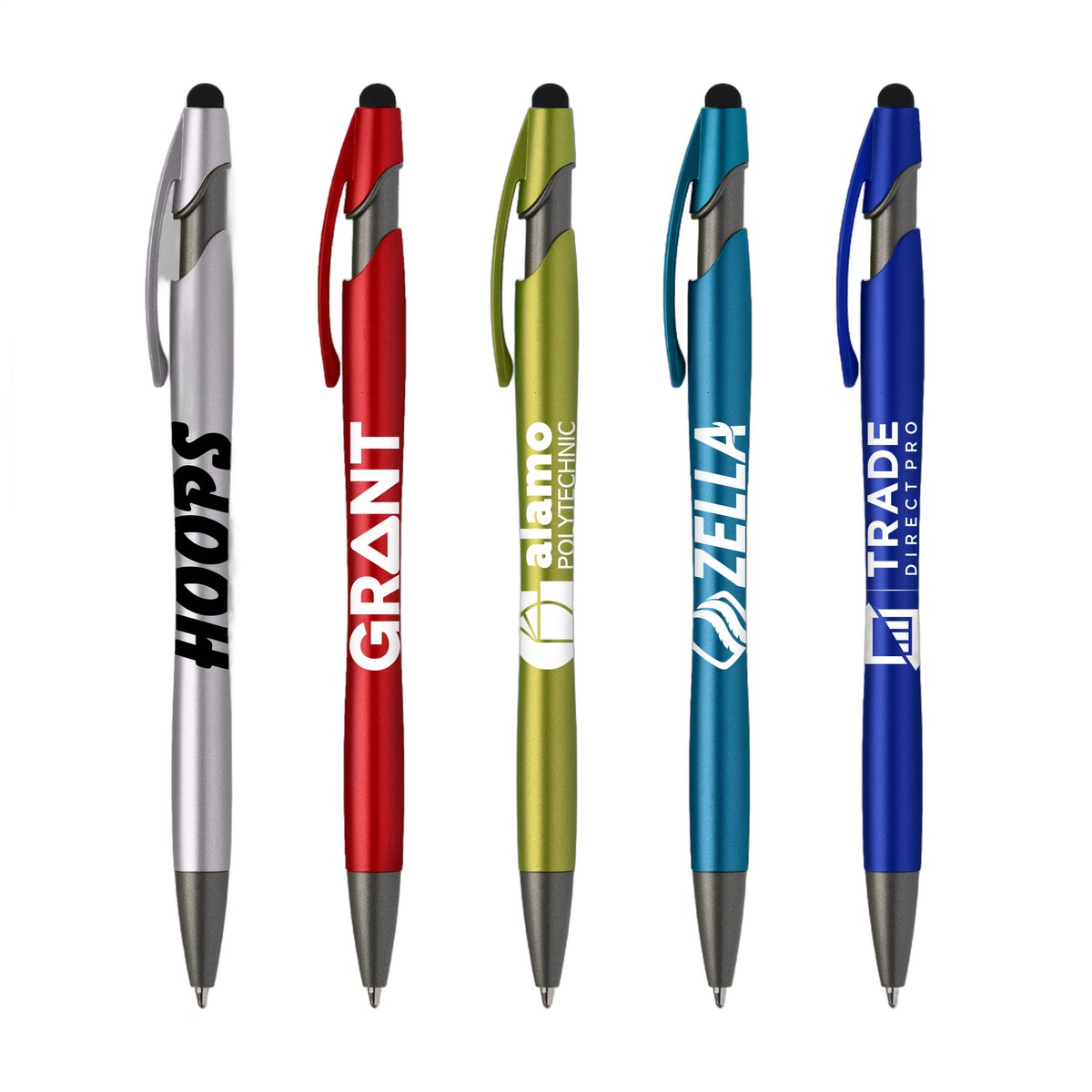 Our new La Jolla Gunmetal Pen with Stylus has contemporary gunmetal accents that will grab extra attention from customers and prospects. This metallic pen with a stylus at the top is the perfect 2-in-1 advertising gift. It features a sleek barrel in vibrant colors, matching clip, and a stylus for touchscreens. Best of all, you can customize it with your logo using ColorJet, our vibrant, full-color imprint technology. Pick up a bundle today to have your customers thanking you for adding style and color to their days! Complies with Prop 65. 5.65" W x 0.41" D