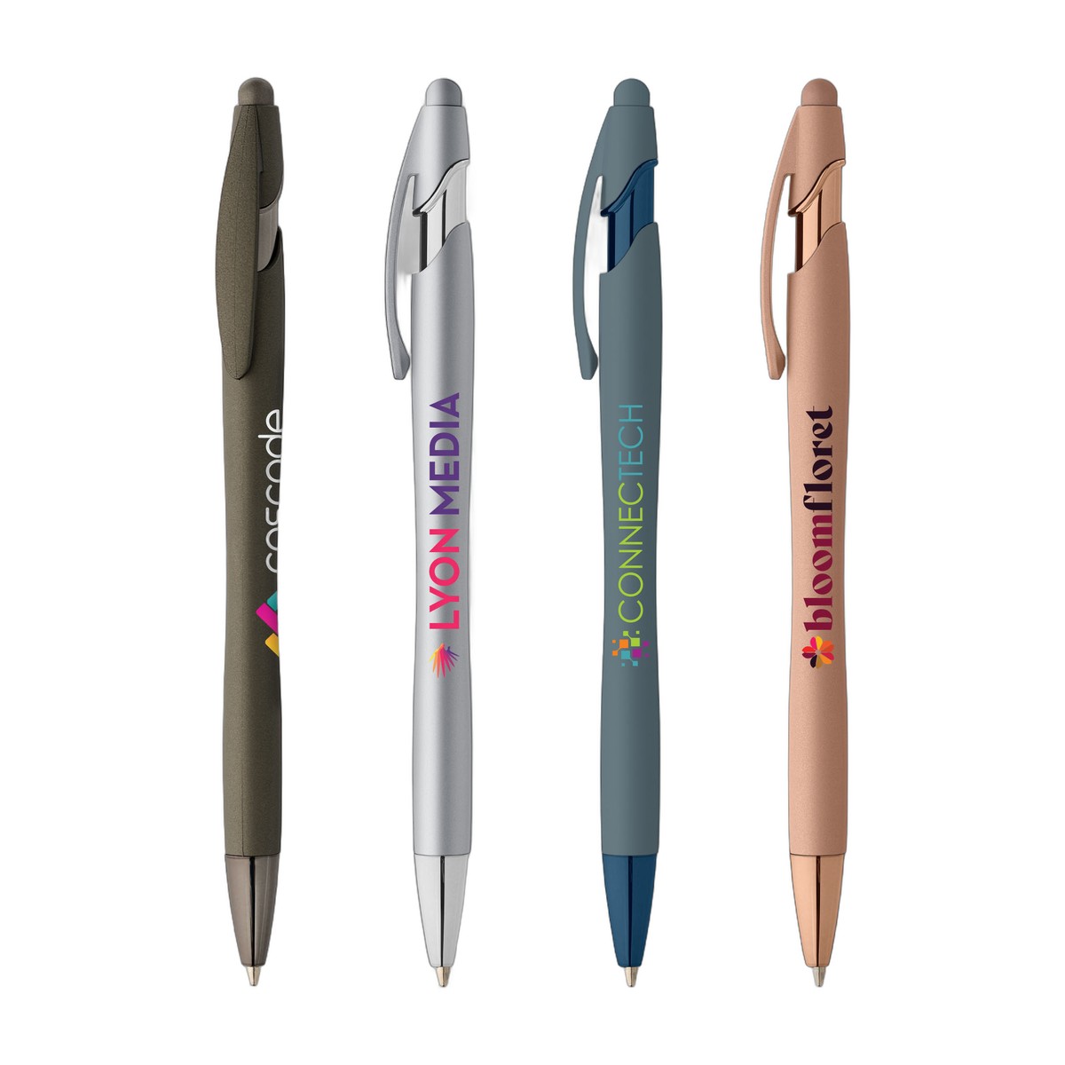 Once clients hold the La Jolla Softy Pen with Stylus, they'll want to use it daily. This sleek, elegant plastic pen uses a trendy monochromatic look throughout the barrel and trim, plus a metallic finish that looks great and is stunning. This medium black ballpoint pen also features a stylus at the top, making this the perfect 2-in-1 advertising gift. . Complies with Prop 65. 5.65" W x 0.41" D