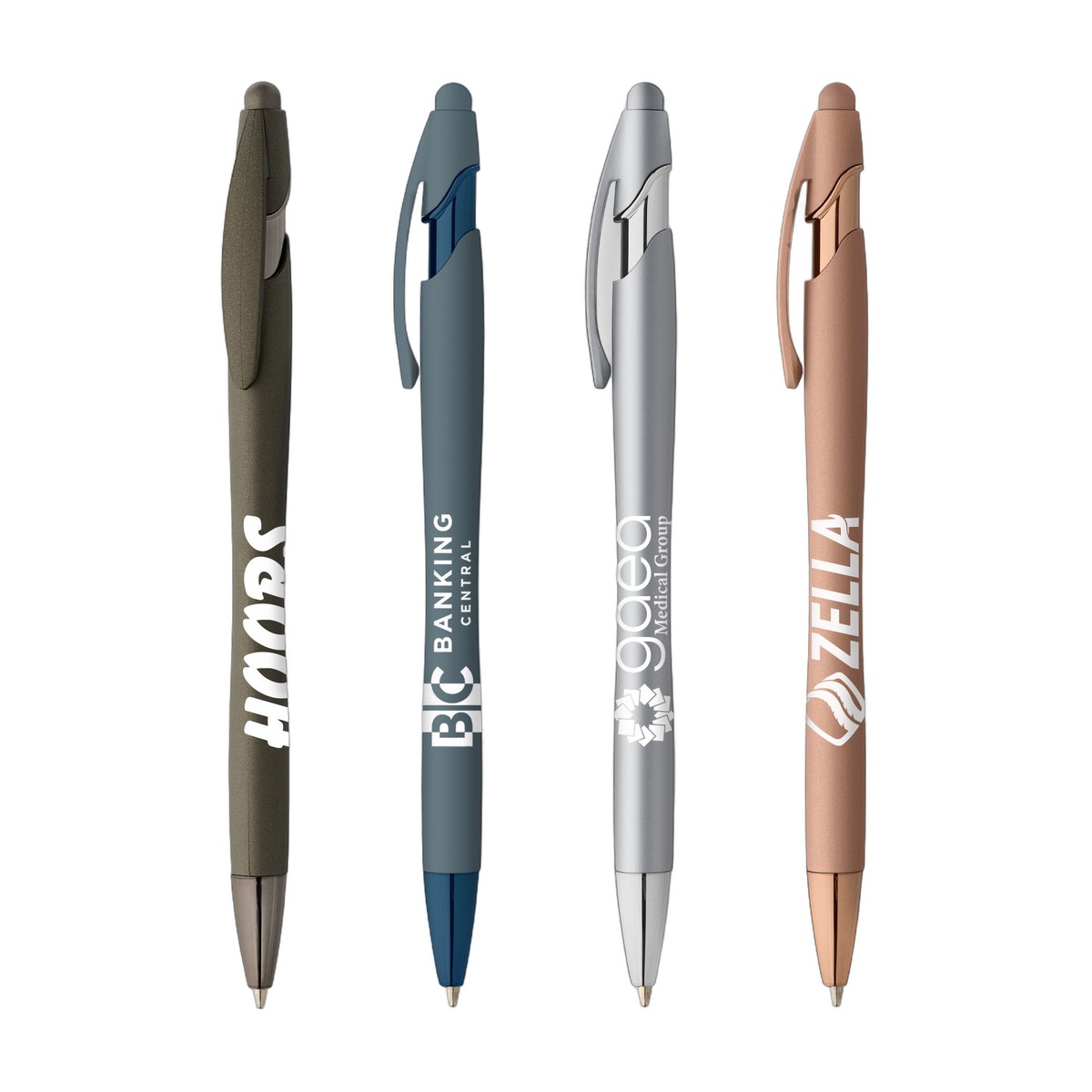 Once clients hold the La Jolla Softy Pen with Stylus, they'll want to use it daily. This sleek, elegant plastic pen uses a trendy monochromatic look throughout the barrel and trim, plus a metallic finish that looks great and is stunning. This medium black ballpoint pen also features a stylus at the top, making this the perfect 2-in-1 advertising gift. . Complies with Prop 65. 5.65" W x 0.41" D