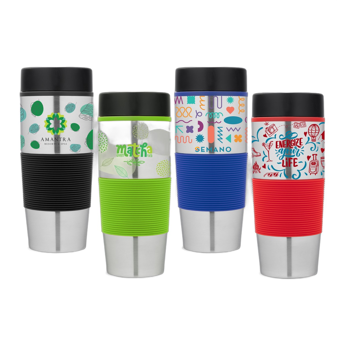 This stainless steel tumbler features a colorful ergonomic silicone grip on the exterior and a matching plastic liner on the interior. The black snap-on lid has a matching colored spill-resistant, slide-top sipping area. . CA Prop 65 compliant. BPA free. Complies with CPSIA, FDA, Prop 65. 7.91" H x 3.24" W