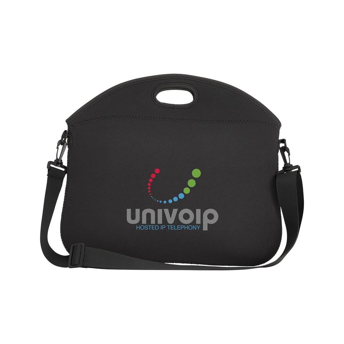 4mm Neoprene tech sleeve with large, zippered main compartment. Features adjustable, detachable, Polyester shoulder strap (up to 51"l). Holds most laptops size 13.3" - 17.3". 16.0000" W x 14.0000" H x 0.2500" D