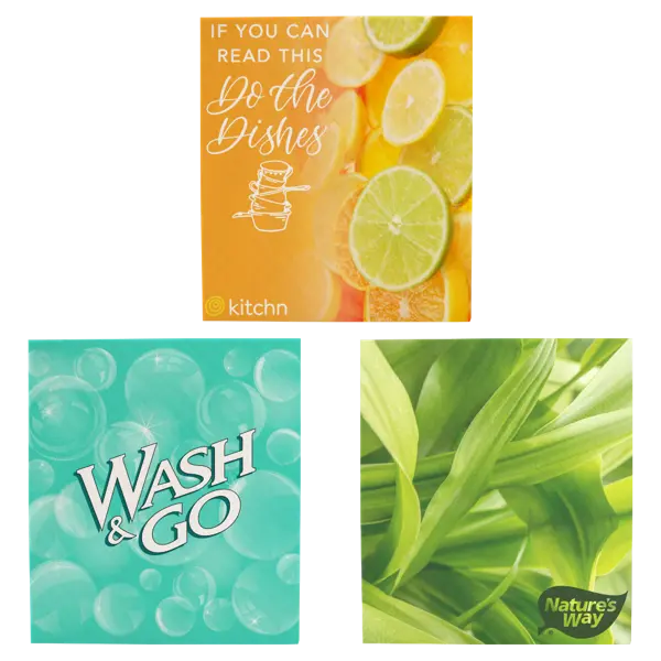 FEATURES:-80% viscose/20% degradable polypropylene fiberdesigned to absorb like a sponge and wipe like a clothreplaces wasteful use of paper towelsMulti purpose uses: wipe windows, kitchen surfaces, wash dishes and morecan be washed in the dishwasherfull color printing. 6.89" W x 7.67" L x 0.078" H