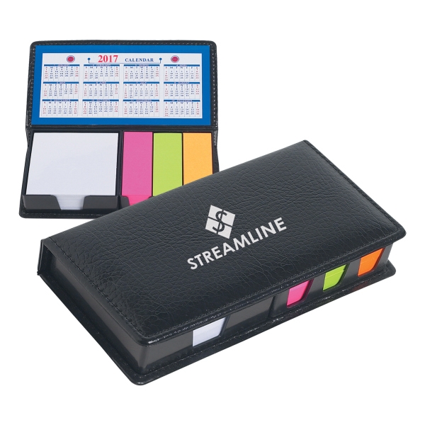 Keep track of important dates and messages with this black leather-look case of sticky notes! With an overall size of 7" x 3 1/2", this handy desk accessory features a calendar, memo paper and sticky flags in three neon colors. Perfect for trade shows attendants and new hires, have your company name and logo imprinted on the surface for a customized corporate giveaway. What a unique way to get your brand name to stick!
