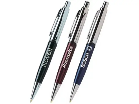 Classic executive style ballpoint with striking silver accents. Solid push action retractable ballpoint pen. High quality jumbo cartridge. Precision silver laser engraved imprint. Each pen is individually cellophaned