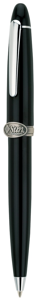 Create your own custom emblem with this brass ballpoint pen. It features a twist-action mechanism, high-gloss black lacquered cap and barrel, chrome clip and trims and a USA-made black ink refill in a triangular gift box. Complies with Prop 65. 5/8" W x 5 5/8" H x 9/16" D