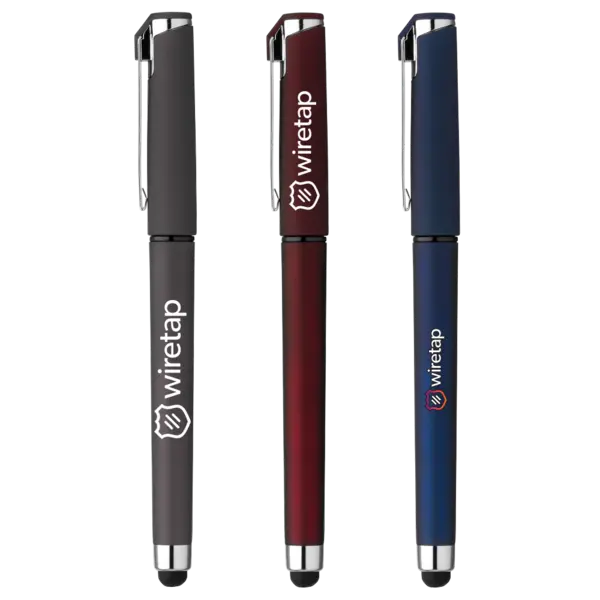 Soft touch gel pen with silver metal accents and clip, touch capacitive stylus, and smudge-proof instant-dry ink. Black gel ink. 6" D x 0.5" W