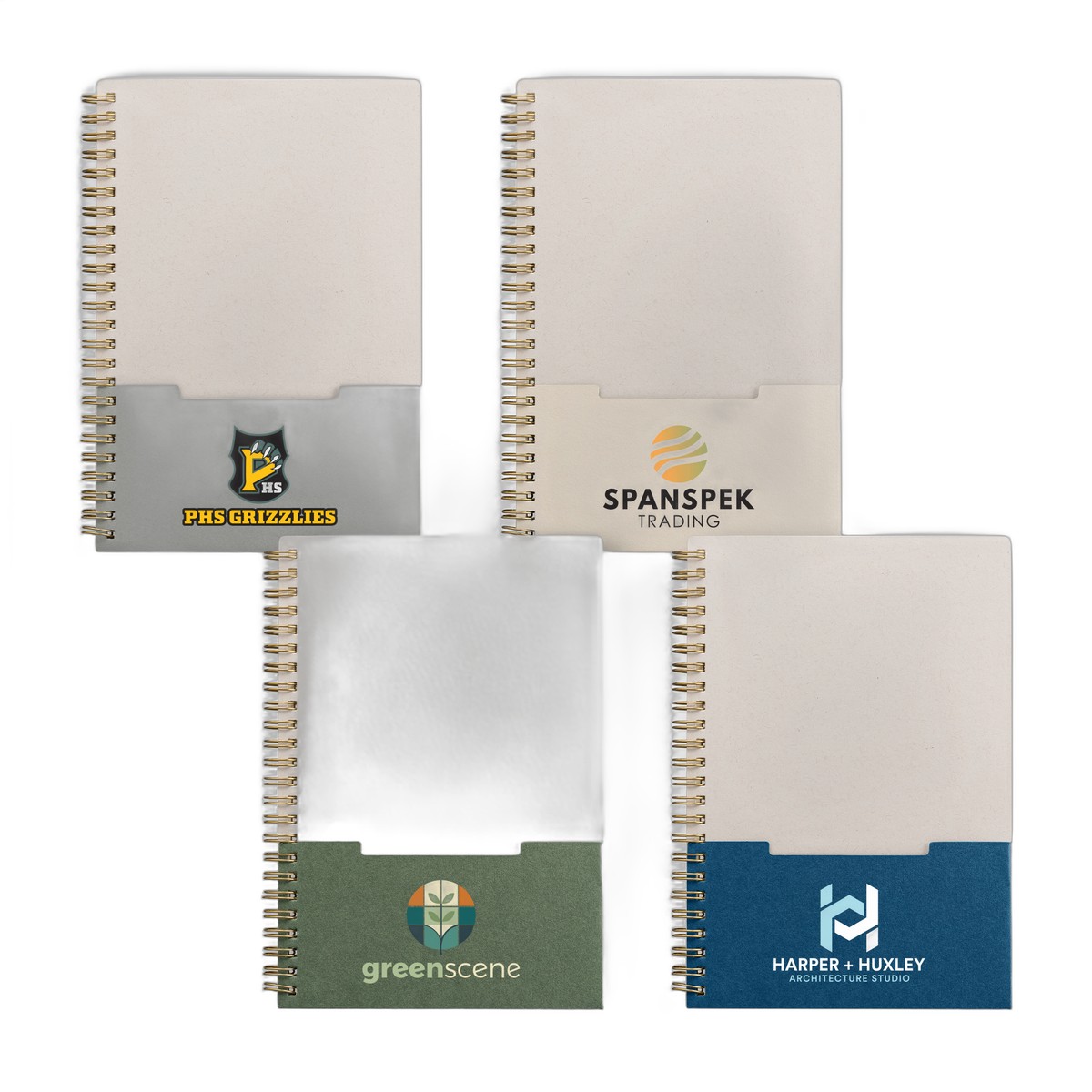 Embrace the beauty of grounded inspiration with the Lino FSC Paper Spiral Binding Vertical Pocket Notebook - A5. This isn't just a notebook; it's a statement of natural charm and modern utility. It features a GRS-certified recycled cotton cover, presented in a serene palette of earthy tones like Blue, Forest, Stone, and Dune, instantly connecting thoughts to nature. The robust A5-sized cover is perfectly paired with a sleek bronze double steel spiral binding, ensuring the notebook lies flawlessly flat for comfortable writing and seamless page turning. A distinctive vertical color-accented pocket on the front offers practical storage for notes, cards, or small documents, adding a subtle yet impactful design element. The Lino A5 is where ideas take root and flourish, always at hand and always in style. 8.46" H x 5.71" W x 0.30" D