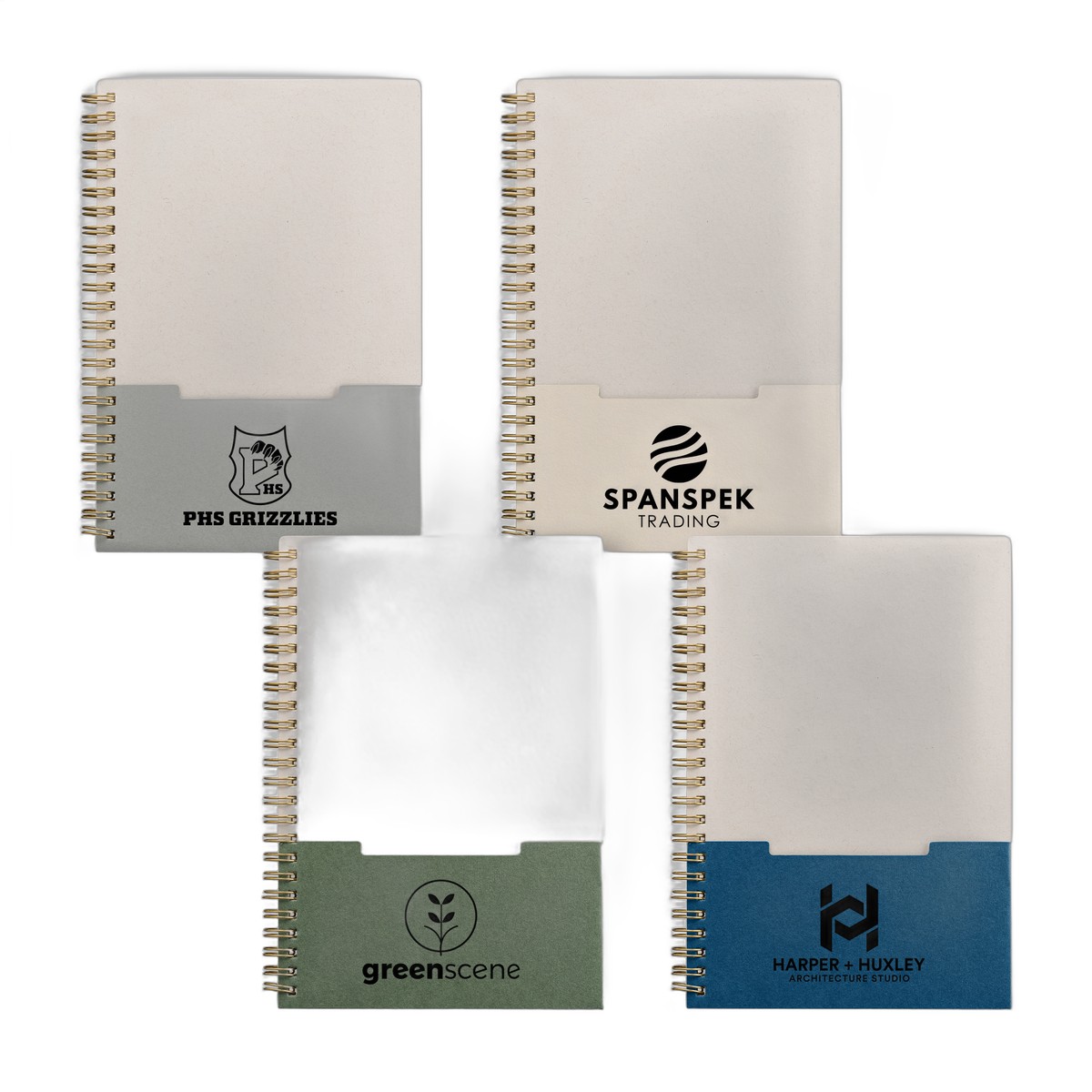 Embrace the beauty of grounded inspiration with the Lino FSC Paper Spiral Binding Vertical Pocket Notebook - A5. This isn't just a notebook; it's a statement of natural charm and modern utility. It features a GRS-certified recycled cotton cover, presented in a serene palette of earthy tones like Blue, Forest, Stone, and Dune, instantly connecting thoughts to nature. The robust A5-sized cover is perfectly paired with a sleek bronze double steel spiral binding, ensuring the notebook lies flawlessly flat for comfortable writing and seamless page turning. A distinctive vertical color-accented pocket on the front offers practical storage for notes, cards, or small documents, adding a subtle yet impactful design element. The Lino A5 is where ideas take root and flourish, always at hand and always in style. 8.46" H x 5.71" W x 0.30" D
