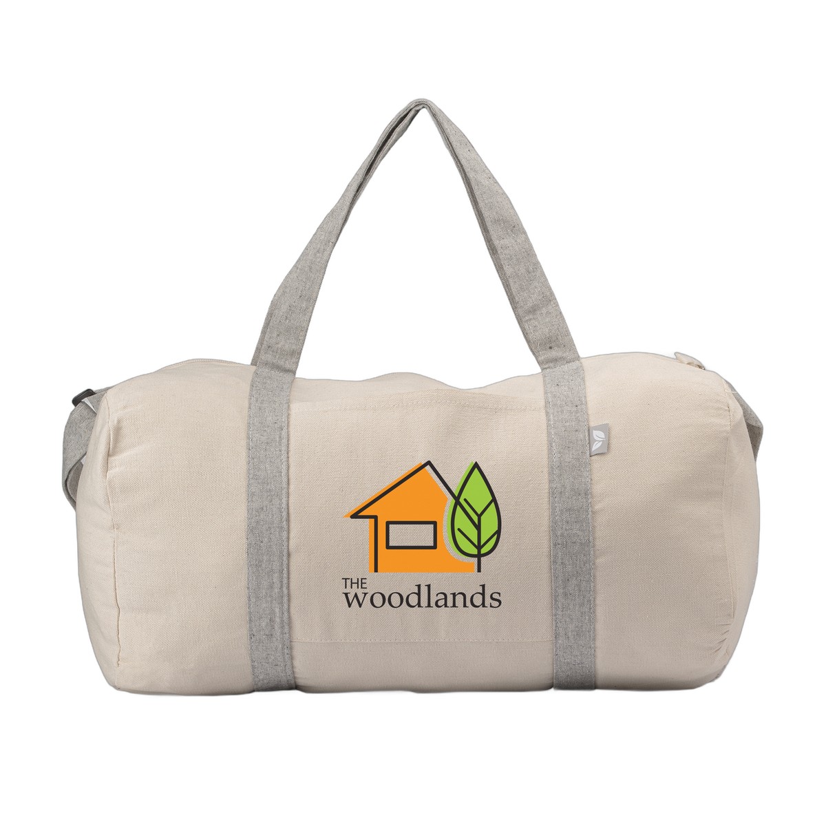 Introducing our Loom - Recycled Cotton Blend Duffel Bag – a travel essential designed for convenience and style. With double handles, an adjustable shoulder strap, a front slash pocket, and a zippered main compartment, this duffle bag is crafted from recycled cotton (55% cotton + 45% polyester), seamlessly blending functionality with environmental responsibility. Boasting a 22.5 L capacity with a max weight of 22 lbs. it's perfect for your travels. The Jacquard material eco tag, featuring a leaf design and "recycled cotton," is sewn on the outside down the right side of the front pocket, making it a chic and sustainable choice. Your logo will be imprinted in Silkscreen. Complies with Prop 65. 9.84" H x 18.11" W
