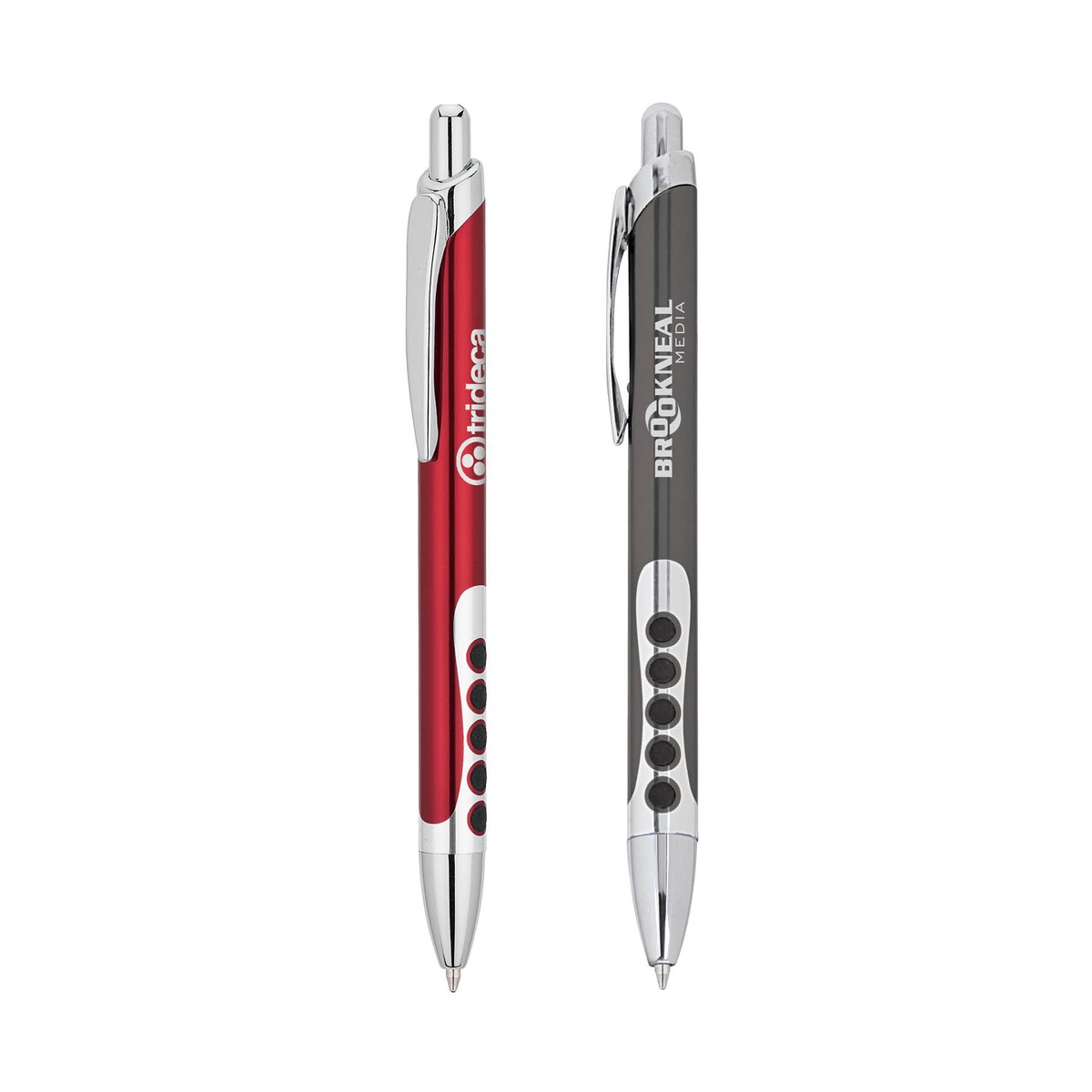 Plunge-action aluminum ballpoint pen with rubber circle designed grip and chrome accents. Complies with Prop 65. 5/8" W x 5 1/2" H x 1/2" D