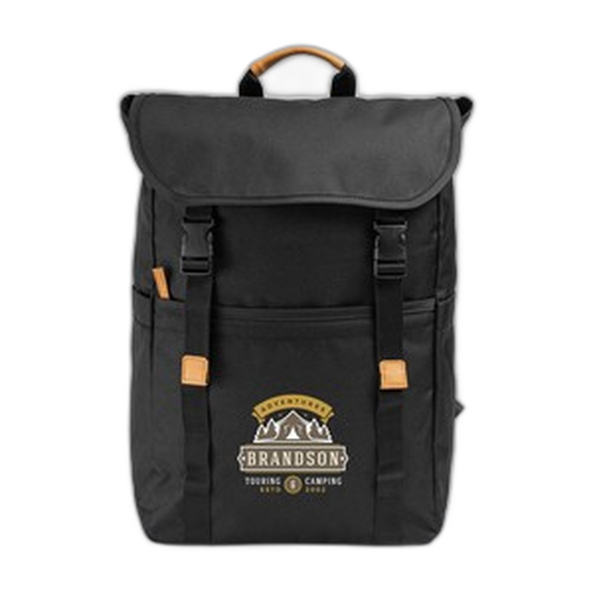 The Lund Backpack combines style and functionality. Crafted from durable 600D rPET polyester with a 210D lining, it features a spacious main compartment with a padded sleeve for a range of laptops including 13", 14", 15", 16" and 17", a zippered front pocket, and two side pockets. It includes a trolley strap, padded adjustable shoulder straps, and a top handle with PU accents. Capacity: 17 L; max weight: 10 kg. Complies with Prop 65. 17.72" H x 11.42" W x 5.51" D