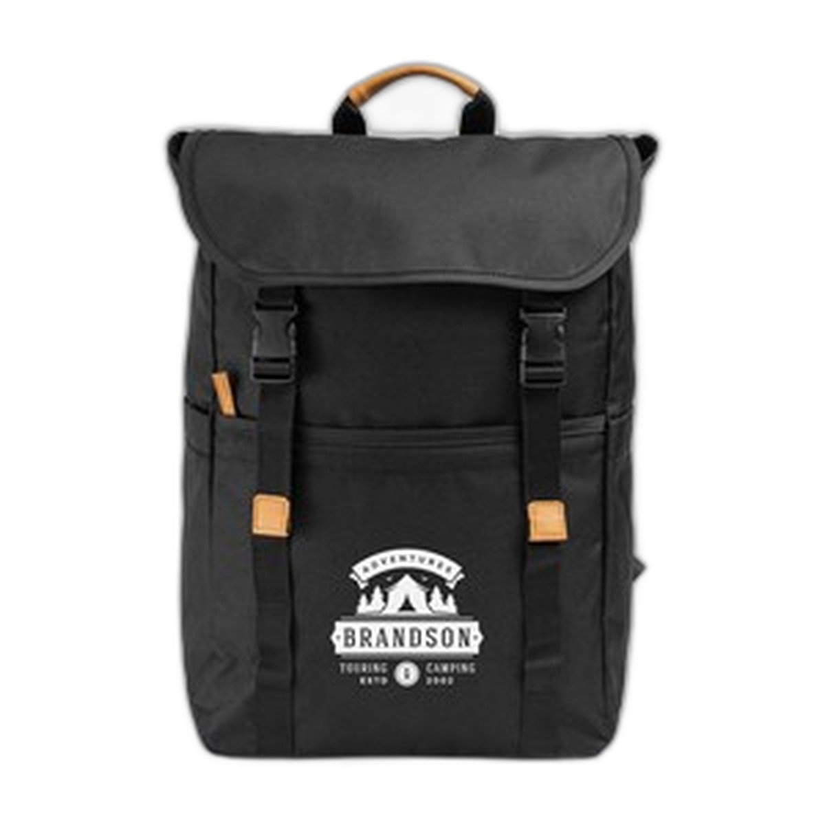 The Lund Backpack combines style and functionality. Crafted from durable 600D rPET polyester with a 210D lining, it features a spacious main compartment with a padded sleeve for a range of laptops including 13", 14", 15", 16" and 17", a zippered front pocket, and two side pockets. It includes a trolley strap, padded adjustable shoulder straps, and a top handle with PU accents. Capacity: 17 L; max weight: 10 kg. Complies with Prop 65. 17.72" H x 11.42" W x 5.51" D