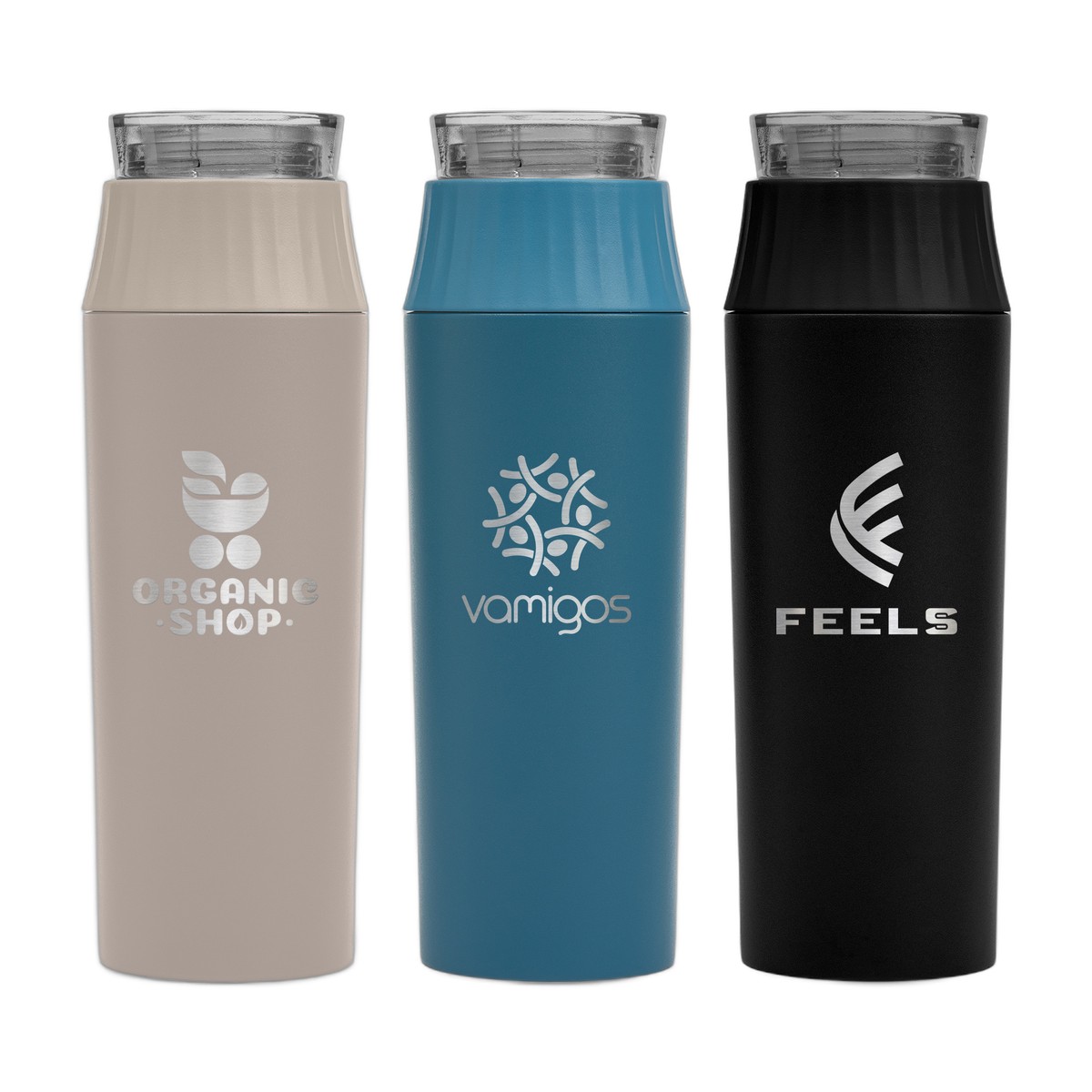 The Majesty Recycled Stainless Steel Leakproof Lid Bottle - 20 oz. is designed with double-wall vacuum insulation, keeping drinks hot for up to 6 hours and cold for up to 24 hours. Made from recycled stainless steel (304), the bottle features a sleek powder coating finish and a leakproof screw-on lid. It has a dual-opening design, the top opens for easy sipping, with a wider opening just below, for easy filling and cleaning. With a capacity of 20oz , it's perfect for both hot and cold beverages. This bottle is BPA-free and not suitable for dishwashers or microwaves. Complies with Prop 65. 9.45" H x 2.87" W