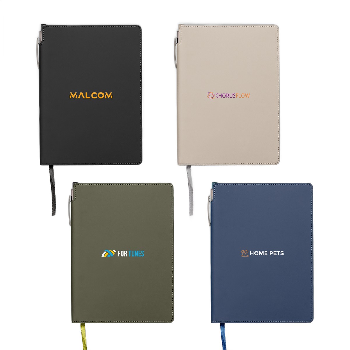 The Malmö Set is a simple, elegant, and coordinated set for everyday writing. This set, an extension of the Malmö collection, features an A5 notebook with a soft cover crafted from polyurethane (PU) with 58% recycled content (including 40% post-consumer and 18% pre-consumer recycled content). The notebook includes a unique design where the extended left side of the cover has a cut-out that functions as a secure pen attachment point (pen loop). Inside the case-bound journal, you will find 80 sheets (160 pages) of 70gsm lined ivory FSC® paper sourced from responsible forestry, ensuring a smooth writing experience. A satin ribbon bookmark in a matching color is sewn in, and the entire cover is finished with matching thread. The set is completed with a #JCD Pen (pen color may contrast with the notebook cover, e.g., a green notebook comes with a black pen). 8.27" H x 6.10" W