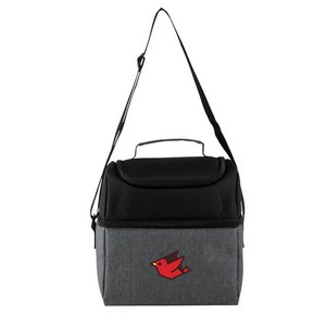 600D/300D two-tone polyester cooler bag with PEVA lining and 5mm PE foam padding. Zip around main compartment; top zip pocket lid; adjustable shoulder strap; two-tone wrapped top grab handle. 6.875" D x 10.25" H x 10.25" W