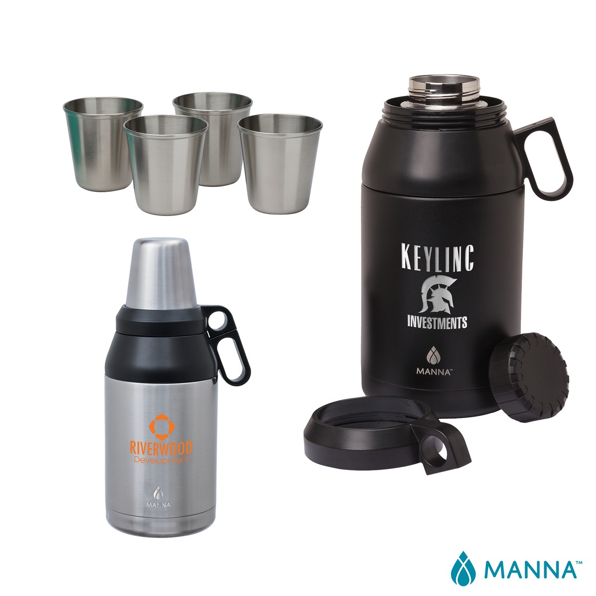 The Manna 64 oz. Stack Growler comes with four stainless steel 12 oz. cups that stack conveniently on top of the growler, locking into place so you can carry them with you wherever you go. Its integrated handle makes this growler easy to transport, and its 18/8 stainless steel, double-wall vacuum insulated construction means your drinks will stay cold for 24 hours and hot for 12. It's perfect for outdoor excursions, and its leakproof lid means you won't have to worry about running dry on the trails. BPA free. Complies with Prop 65. 5" W x 13 11/16" H x 5" D
