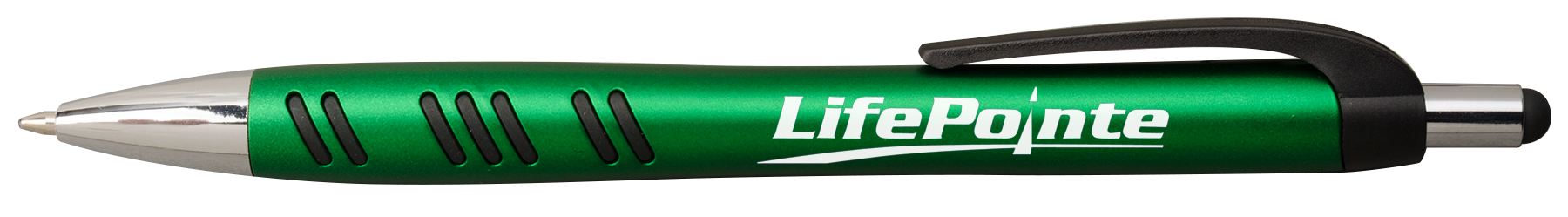 Ultramodern stylus pen is sleek and stylish. Rich shimmering metallics contrast with matte black and shining silver trim. Jumbo hourglass shape and rubber grippers provide exceptional writing comfort. Smooth writing black ink. Material: Plastic Standard Decoration Includes: 1 Color, 1 Location All Available Decoration Options: Silk Screen: 2" W x 0.63" H Barrel Tip Type: Ballpoint Mechanism: Push Retractable Standard Packaging: Bulk Tags: popular, plastic, tech, accessory, phone, tablet, tradeshow, trade, show, desk, office, advertisement, college, grade, writing, merchandise, study, high school, university, home