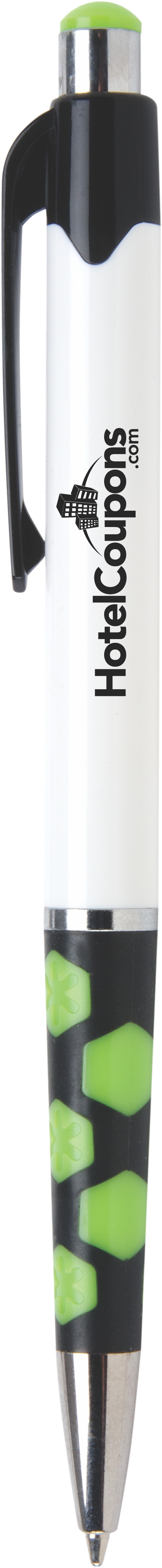 Double injected rubber grip features hexagons in 8 vivid colors. Glossy black and silver trim contrasts with bright white barrel. Guaranteed ultrasmooth writing cartridge in blue (default) or black ink. Patent number D709,951. Material: Plastic Standard Decoration Includes: 1 Color, 1 Location All Available Decoration Options: Silk Screen: 1.88" W x 0.5" H Barrel Full Color: 2" W x 0.25" H Full Color Barrel Tip Type: Ballpoint Mechanism: Push Retractable Standard Packaging: Bulk Tags: plastic, cost effective, popular, pen, tradeshow, trade, show, desk, office, advertisement, college, grade, writing, merchandise, study, high school, university, essay, list, home