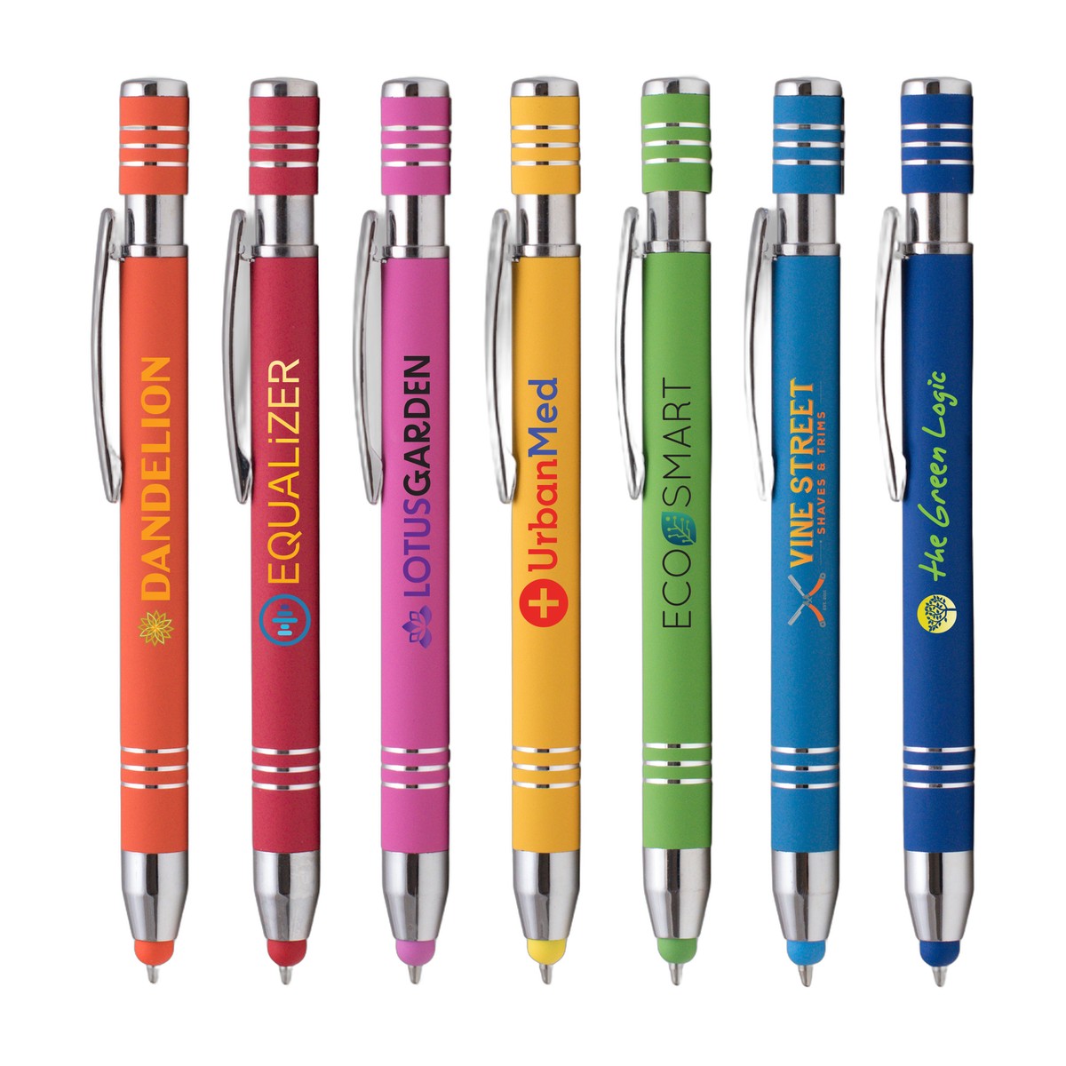 An upscale-looking metal pen with a comfortable, rubberized soft touch finish. Featuring a medium ballpoint and a touchscreen capacitive stylus, the Marin Softy pen makes a great premium business gift. Select from a variety of vibrant barrel colors, all adorned with chrome accent rings. Decorate with a full-color, photo-quality imprint with our innovative ColorJet printing capabilities. Complies with Prop 65. 5.43" W x 0.42" D