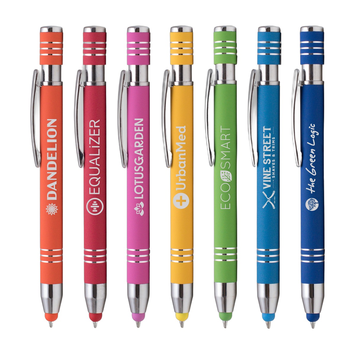 An upscale-looking metal pen with a comfortable, rubberized soft touch finish. Featuring a medium ballpoint and a touchscreen capacitive stylus, the Marin Softy pen makes a great premium business gift. Select from a variety of vibrant barrel colors, all adorned with chrome accent rings. Decorate with a full-color, photo-quality imprint with our innovative ColorJet printing capabilities. Complies with Prop 65. 5.43" W x 0.42" D