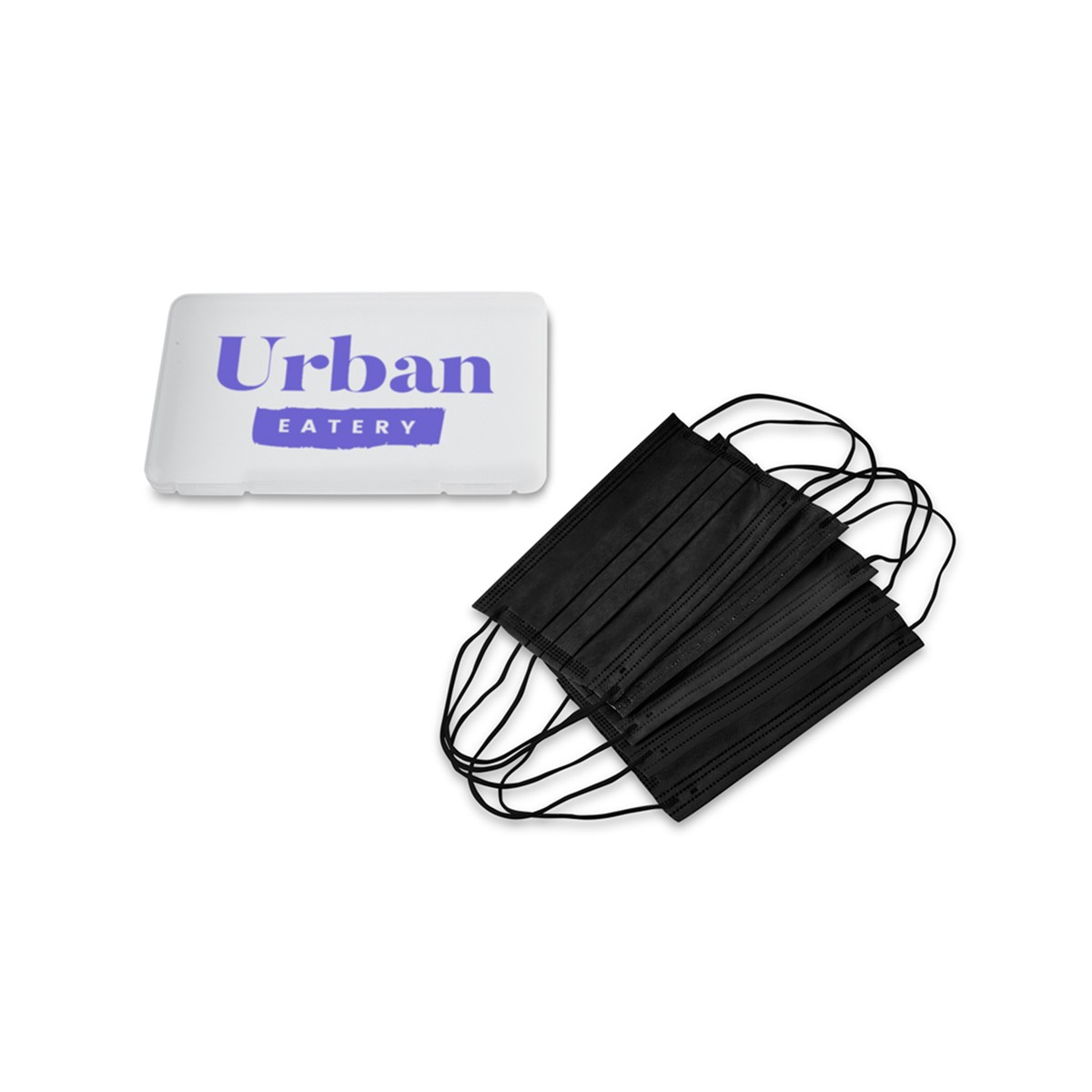 Clear frosted Polypropylene Plastic storage case packed with five 3-ply disposable face masks. Features Antimicrobialadditive in the case to protect the product itself. The product does notprotect the user against bacteria, viruses, etc. Each set includes 5 masks all of one color, except for Multi which includes assorted color masks. Adult face mask made of 3-ply Non-Woven Polypropylene. Soft elastic ear loops for added comfort in wear. Anti-dust lightweight breathable fabric. Thin bendable wire in upper panel for bending to fit closely to nose. Not intended for medical use; not recognized by the CDC or FDA as safe or effective against COVID-19 or any virus; no guarantee item will protect user from any illness. 7.7500" W x 4.2500" H x 0.5000" D