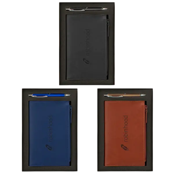 Two piece gift set with 80 sheet PU/split leather and suede Mason Notebook and black ink textured aluminum Loft Metal Ballpoint Pen. Packaged in black gift box.